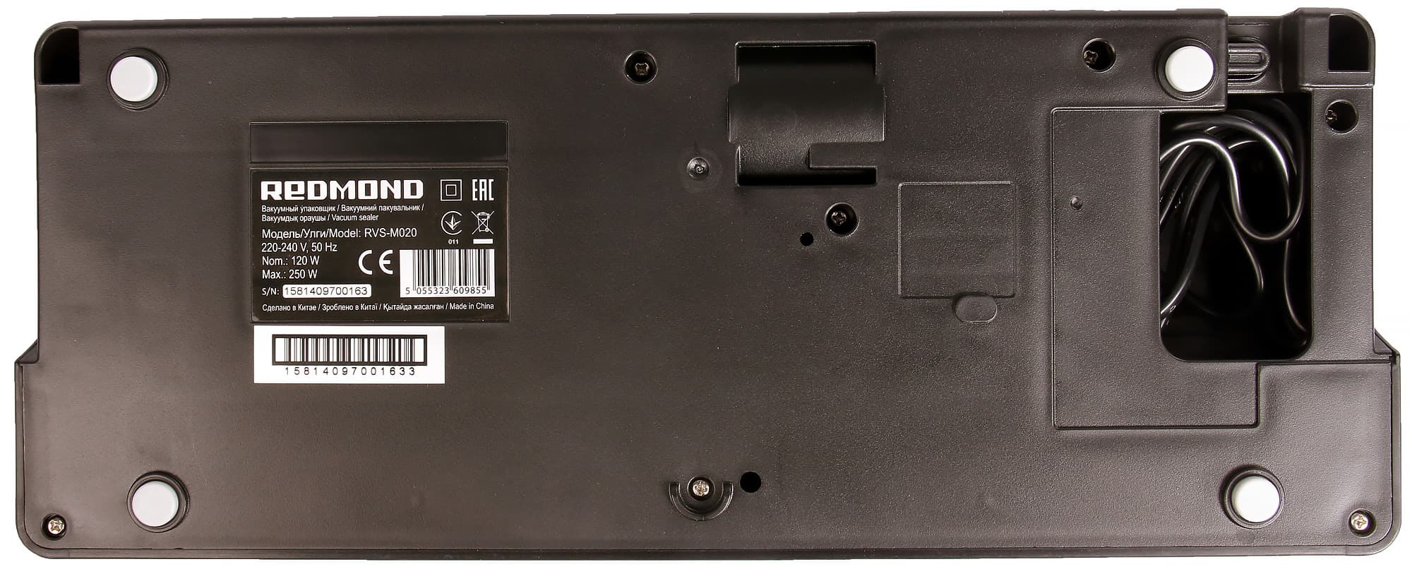 На внутренней стороне крышки можно увидеть термоленту — запаивающую планку с тефлоновым покрытием, фиксаторы крышки и отсек для хранения шланга для вакуумирования контейнеров. В комплект к вакуумному упаковщику Redmond RVS-M020 указанный шланг, также как и специальные контейнеры, не входит.