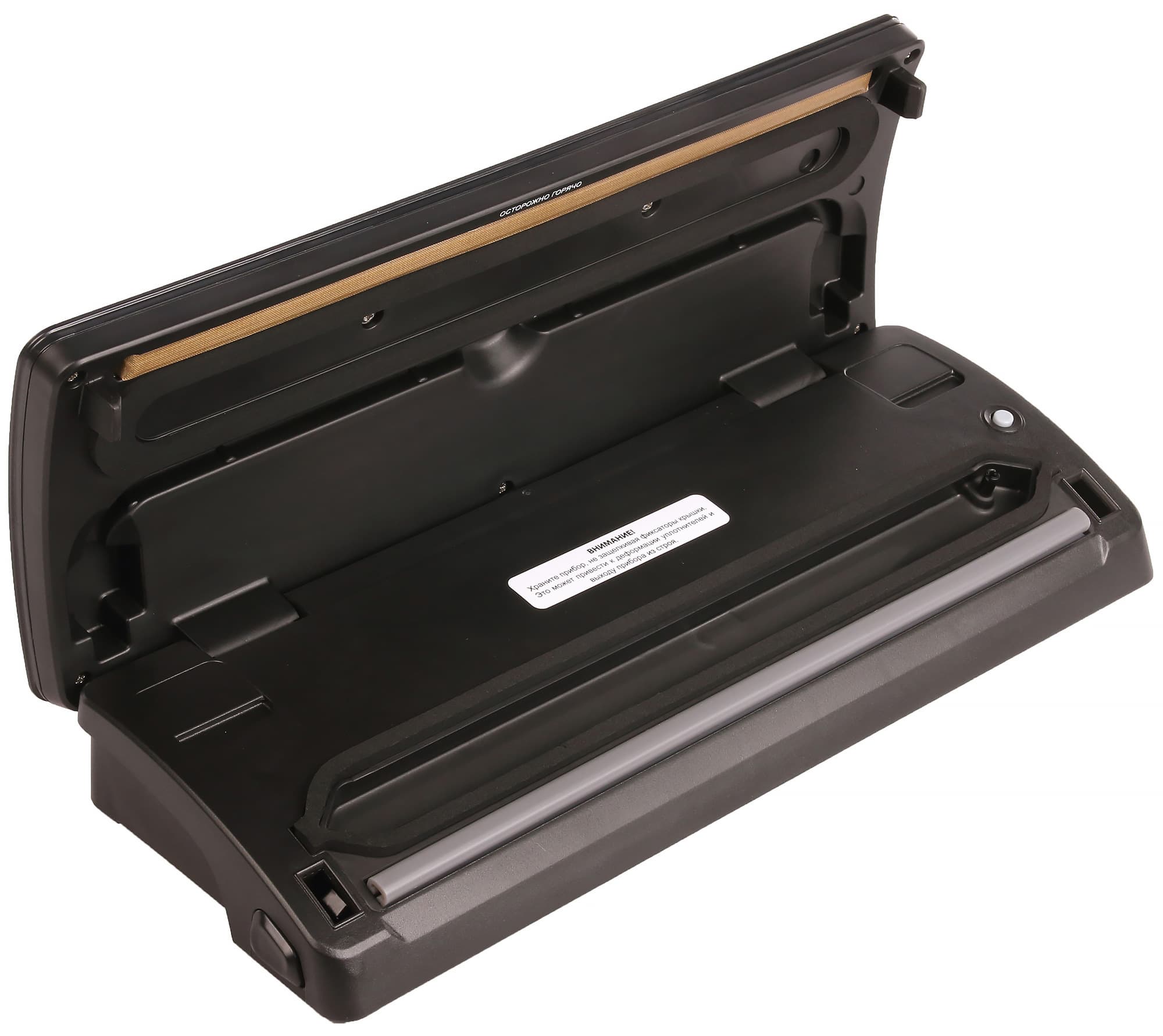 На боковых сторонах основания находятся кнопки разблокировки, которые предназначены для открывания крышки по завершению процесса вакуумирования и запечатывания пакета. Соответственно закрывается откидная крышка при нажатии на передние углы.