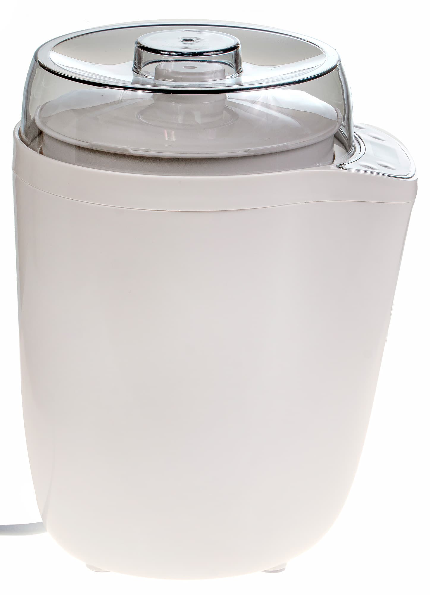 Корпус йогуртницы компактен, вытянут вертикально и не занимает много места на столе. Длинный шнур дает возможность выбирать место установки прибора поудобнее, даже если оно далеко от розетки. Корпус сделан из белого пластика и довольно увесист. Пластик приятный на ощупь, не скользкий. Форма прибора сложная, но стремится к цилиндру, на котором есть выступ с расположенной на нем панелью питания. Нижняя часть прибора немного уже верхней, и у него есть чуть заметные проблемы с устойчивостью: лучше не толкать его и не перемещать волоком.