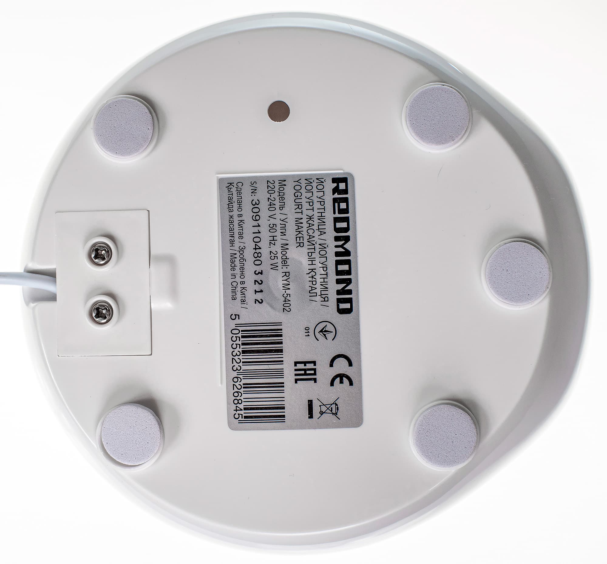 На одной из условно боковых сторон на шести языках, обычных для Redmond (русский и английский вошли) перечислены технические характеристики: напряжение в сети, мощность, материал корпуса (пластик), наличие пяти программ, таймер на 99 часов, электронный тип управления. Отмечается также, что в комплект входит сито для творога и два стакана объемом 1600 и 1800 мл.