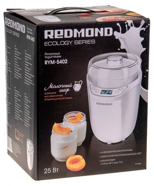 Традиционная для Redmond черная коробка традиционно украшена одинаково с двух широких сторон: там на фоне молочной кляксы изображены сама йогуртница в рабочем режиме и две баночки с йогуртом, украшенные половинками персика. Из информации здесь есть надпись «Молочный шеф: домашние кисломолочные продукты для всей семьи», мощность прибора — 25 Вт и три основных достоинства йогуртницы: 5 автоматических программ, технология приготовления sous-vide и опция «Мультиповар» с диапазоном температуры от 25 до 65 градусов. Вся-то и разница, что на одной стороне эта информация по-русски, а на другой — по-английски.