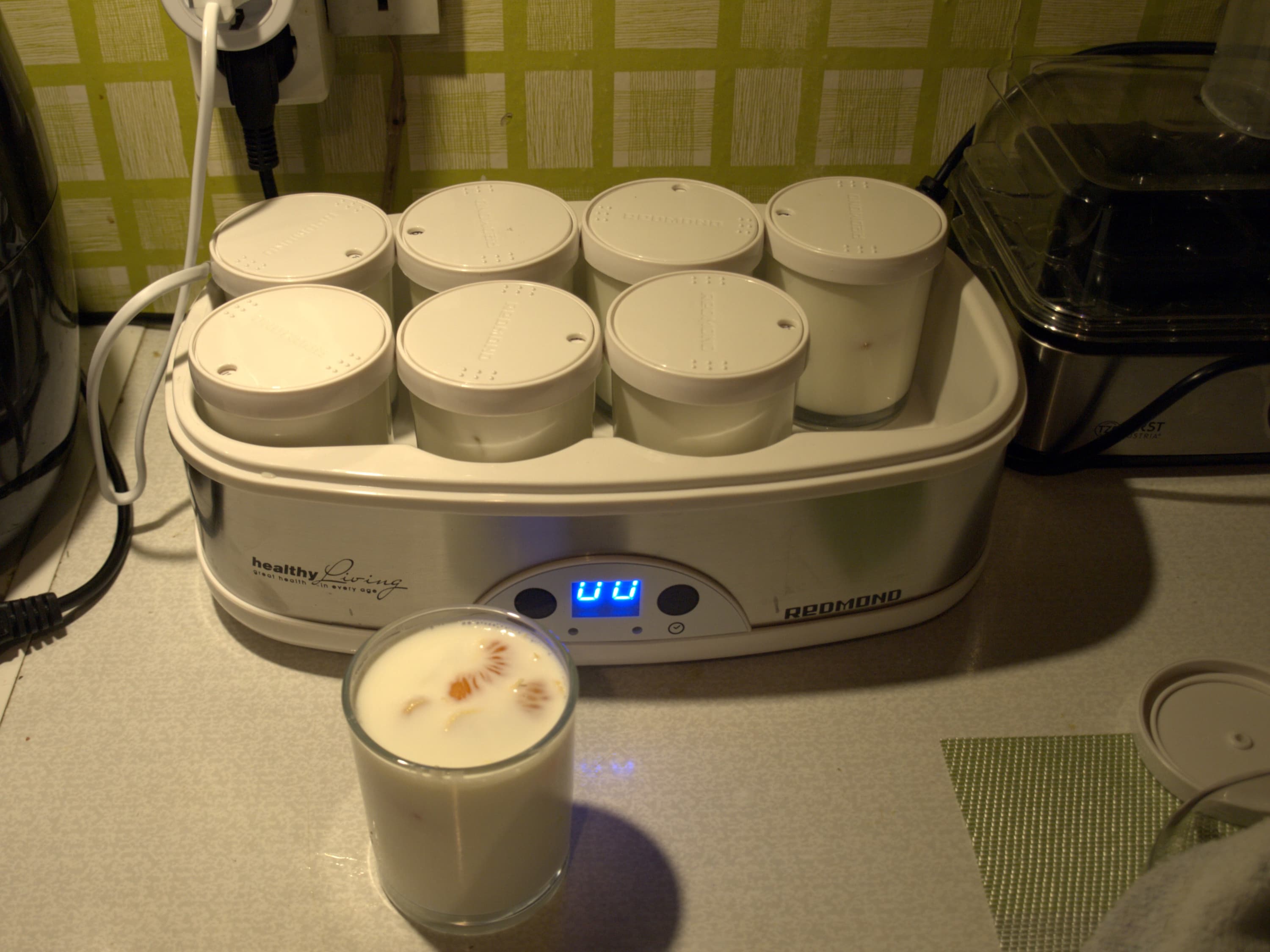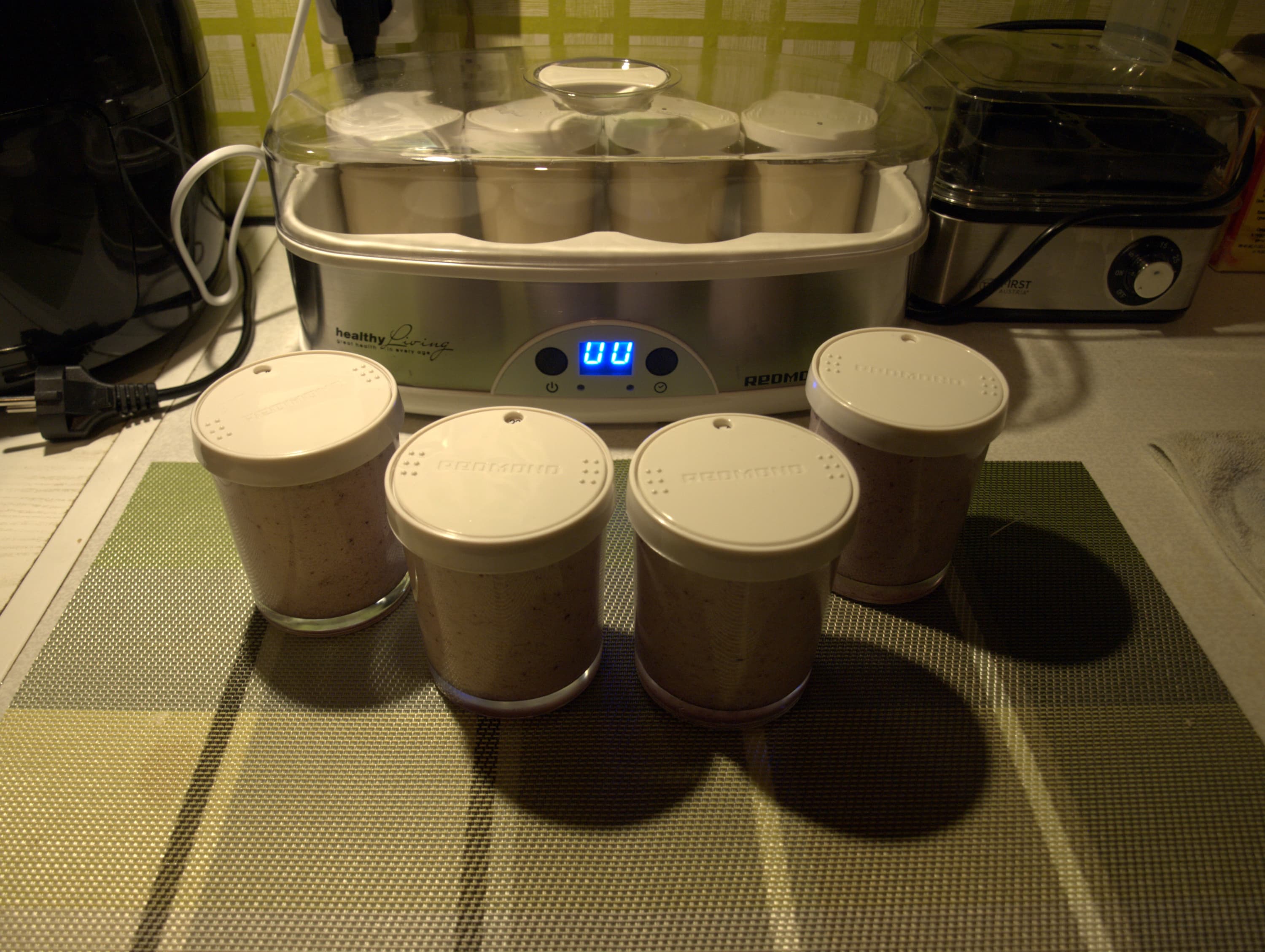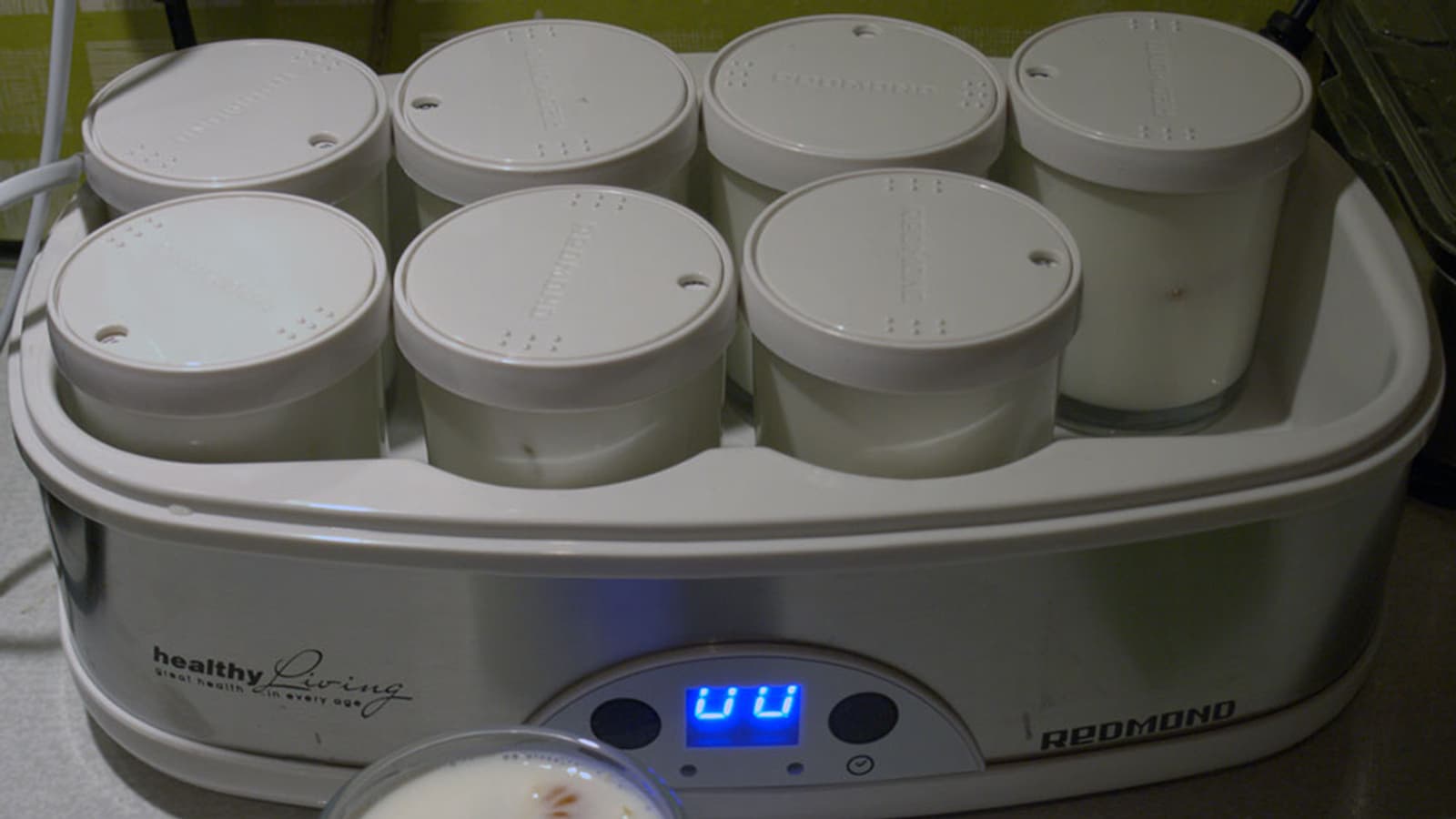 Красивый, простой прибор отлично вписался в интерьер, не занял много места и быстро стал привычным. Работает он бесшумно, хитрых особых условий для себя не требует: ровное место на столе и доступ к розетке. Поле для кисломолочных экспериментов бесконечное, но лежит вне компетенций прибора. Выбор закваски, способов закваски (живым или сухой смесью), обработки продукта (творог, например, еще нужно сцедить) никак не связан с Redmond RYM-M5401-E.