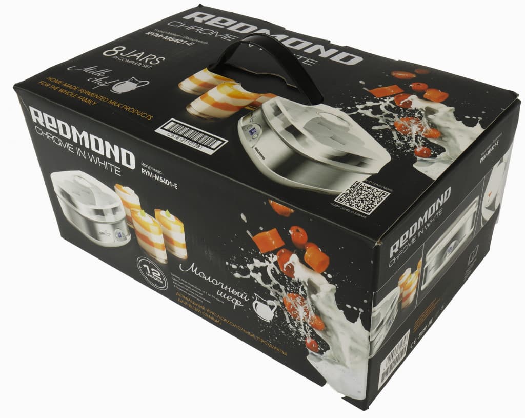 Броская, глянцевая упаковка Redmond узнаваема: на черном фоне серебристым напылением нанесены имя бренда и название модели, яркие снимки йогуртницы и йогуртов. Надписи нанесены на русском и английском, краткие технические характеристики на боковой панели переведены на 26 языков. У коробки удобная ручка, на крышке — товарный штрихкод и QR-код с переходом на страницу RYM-M5401-E на официальном сайте. Внутри прибор защищает овальная крышка из пенопласта.