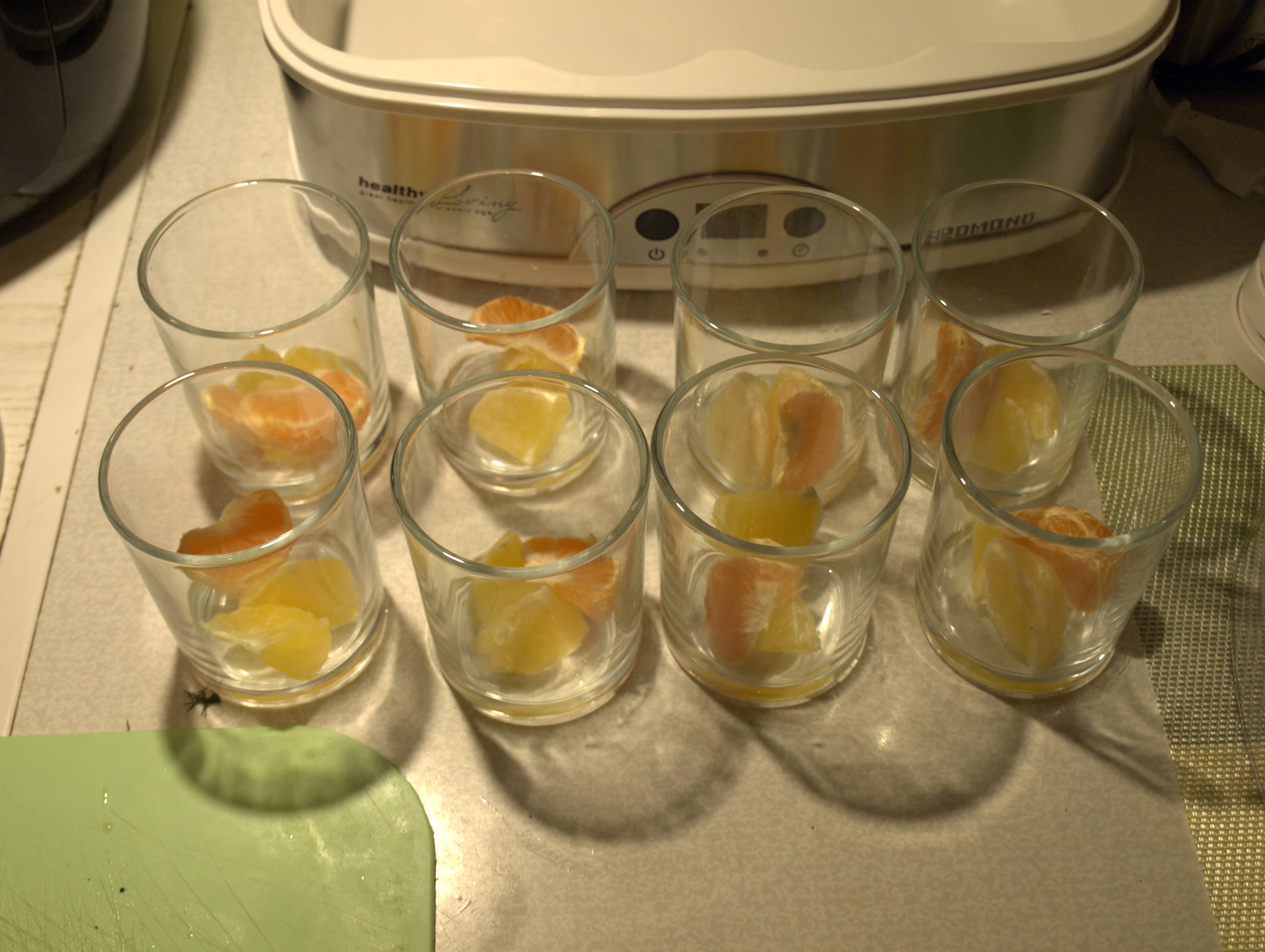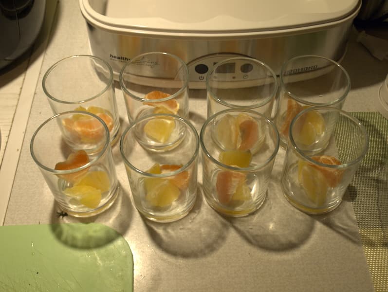 Нам понадобилось молоко (1,5 литра), пакет сухой закваски (1 г), мандарины и апельсин. Дольки цитрусовых выложили в банки. В отдельную емкость высыпали сухую закваску, постепенно добавили нагретое молоко, тщательно размешали, разлили смесь по баночкам. Йогуртницу запустили на 8 часов, готовый йогурт поставили в холодильник на 3 часа. Сластены могут добавить перед этим немного сахара. На выходе получился нежный йогурт с резкой сладостью цитрусовых. Поторопились употребить, он вышел жидковатым.