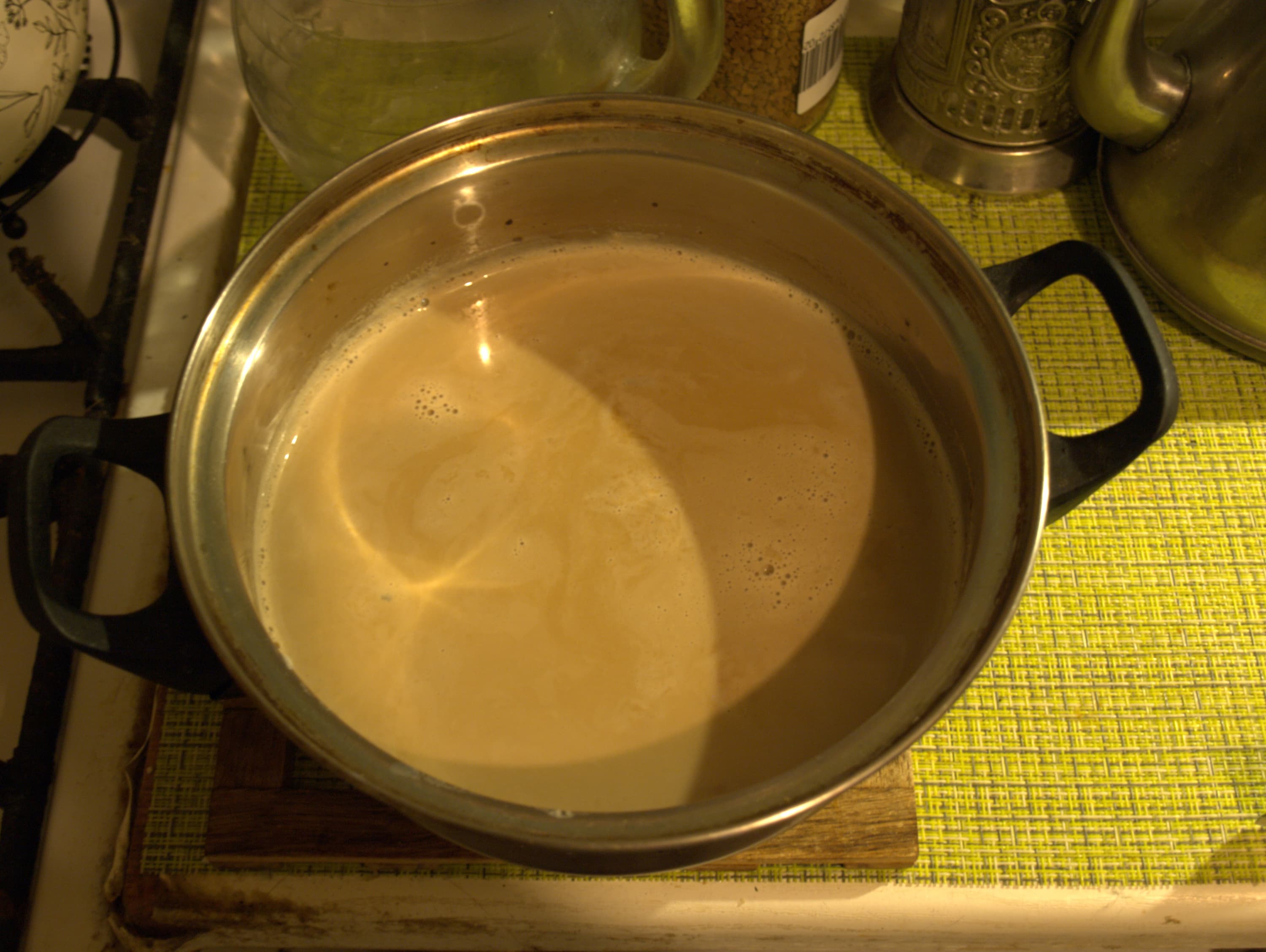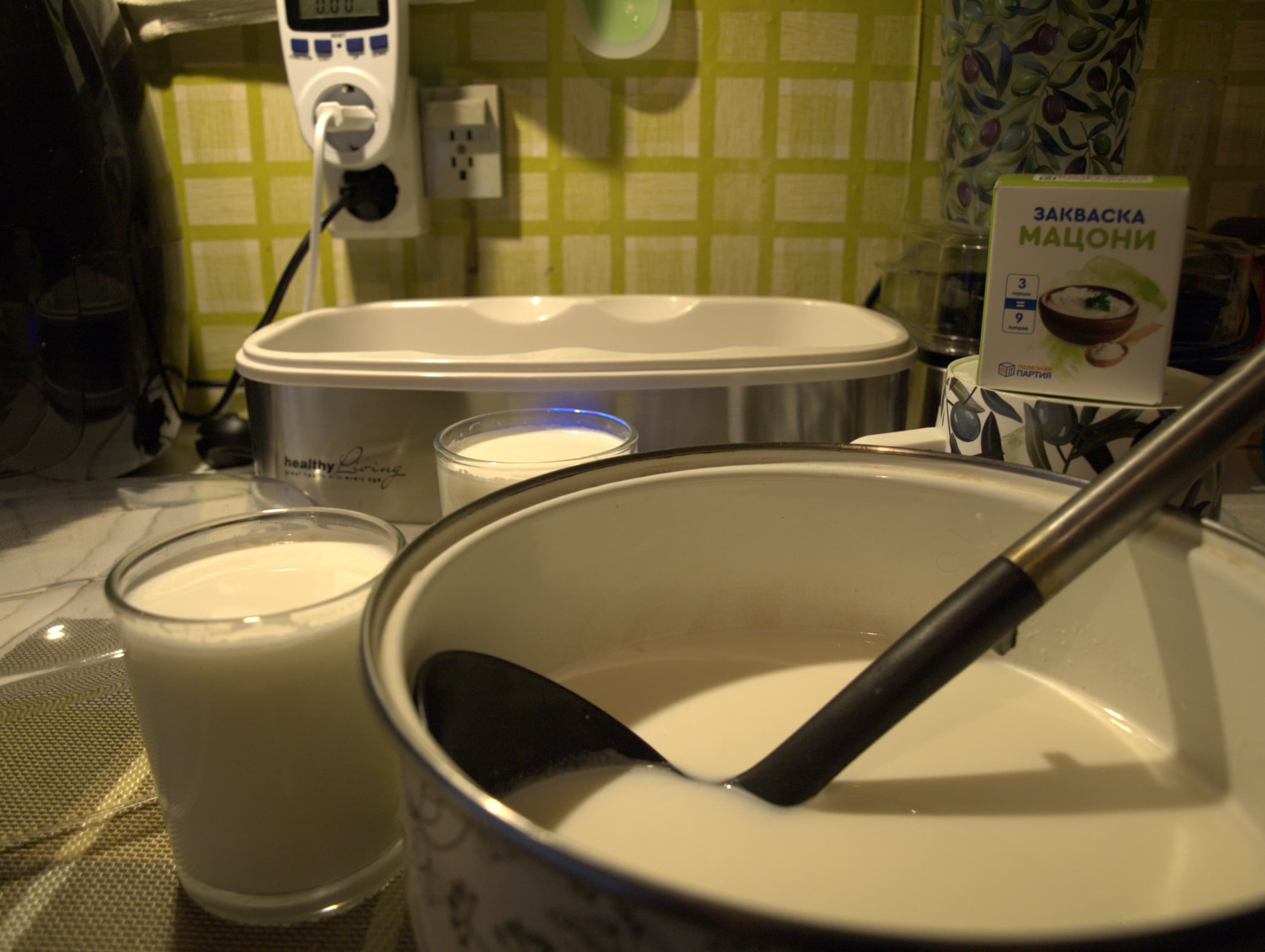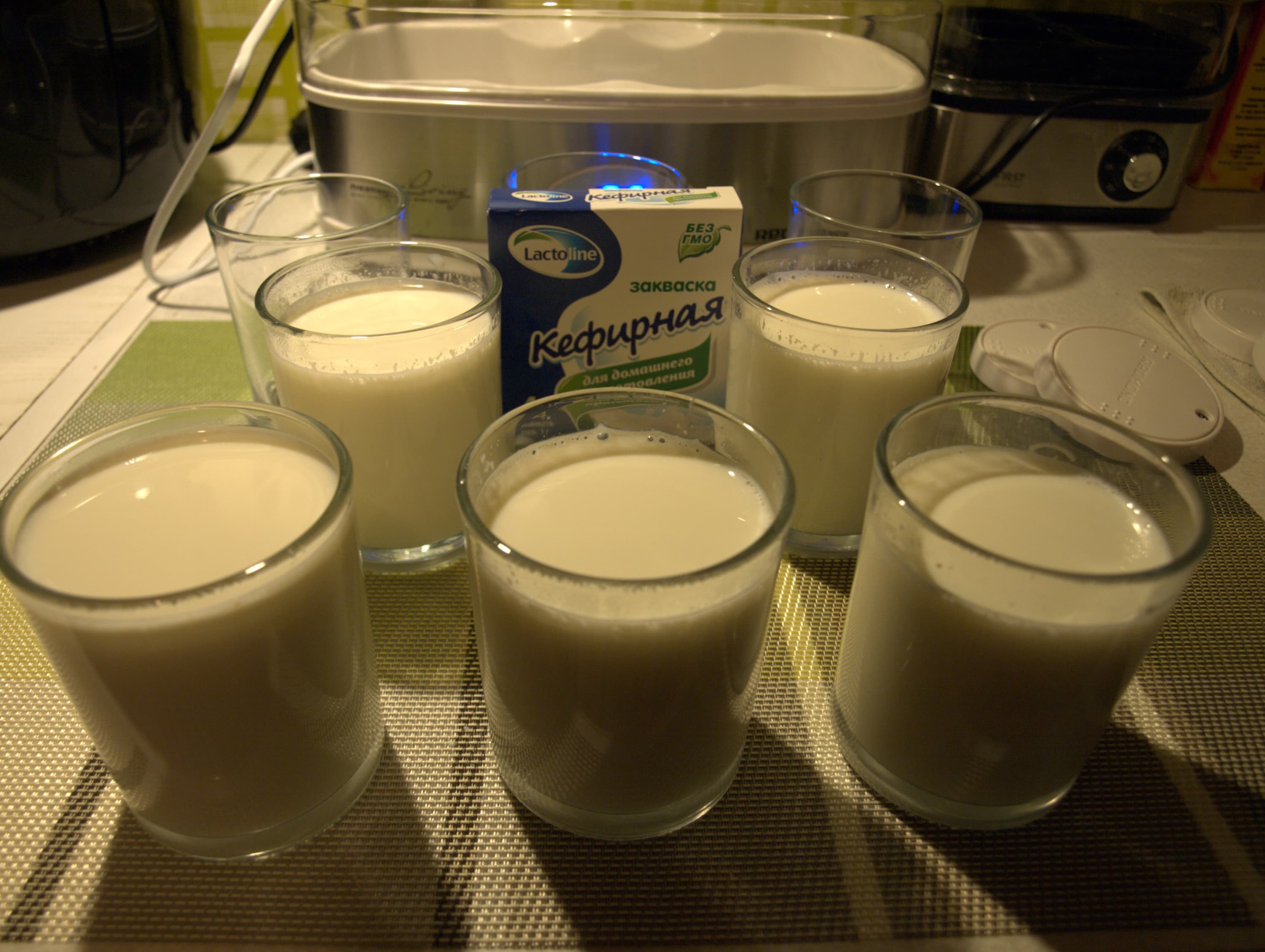 Всего два ингредиента: молоко и кефирная закваска. Молока берем 1 литр на 3 г закваски. Экспериментировали, уменьшая закваску: вкус меняется не критично.