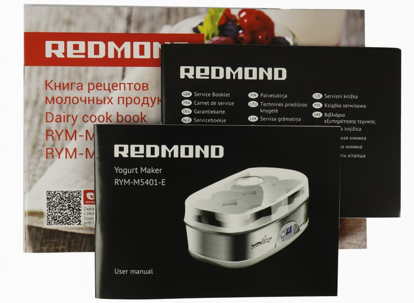 Мануал у Redmond традиционно скуп: небольшая брошюра формата А4 на 12 языках. Русский текст начинается на 49-й странице. Примечательно, что схема прибора расположена на 3-й странице. Всего перечислены: меры безопасности, технические характеристики, комплектация, описание устройства прибора (страница 3) и правила эксплуатации. Коротко о приготовлении смеси, выставлении даты и уходе за йогуртницей. Завершает русский текст описания возможных неисправностей и гарантийные обязательства бренда.