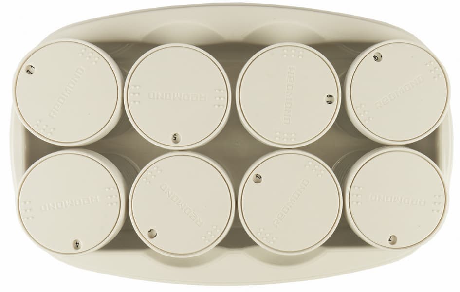 Она очень элегантна, эта компактная, овальной формы невысокая йогуртница, позволяющая готовить порционно, а не в единой емкости. Очень аккуратная, выполненная в серебристо-белых тонах, вмешает в себя восемь баночек общим объемом почти в 1,5 кг продукции. Баночки сделаны из плотного стекла, которое легко отмывается. Каждая оснащена удобной крышкой с возможностью ручной датировки: часть крышки вращается, позволяя выставить нужную дату: 1, 2, 16 или 25.