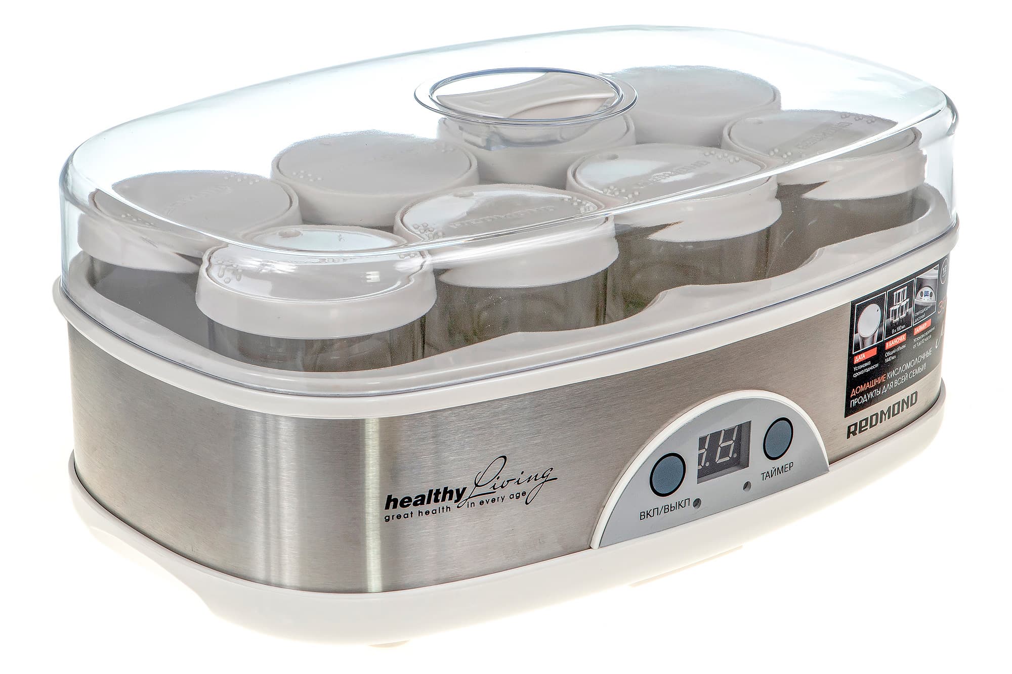 Йогуртница пришла на тесты в аккуратной, небольшой, картонной коробке с ручкой. Коробка стандартного дизайна Redmond — красочные фотографии, черный фон, белый и серебряный шрифт. Устройство защищено амортизирующей пенопластовой вставкой, а находящиеся внутри него баночки — картонными вставками.
