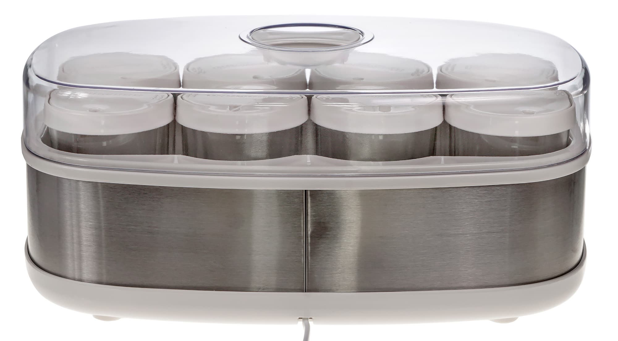 В процессе изготовления кисломолочных продуктов крышки с баночек должны быть сняты. Мы пробовали положить крышки в саму йогуртницу, под баночки, но все 8 штук туда не влезли по ширине. А если класть по две под 4 банки — то по высоте. Это кажется небольшим недостатком, поскольку нужно дополнительно выделять какую-то тару под их хранение. К тому же, если бы можно было ставить баночки на крышки, это решило бы проблему оптимального распределения тепла внутри банки, так как дно все-таки греется сильнее, чем верхняя часть продукта. Без крышек это решается путем наливания небольшого количества воды внутрь прибора.
