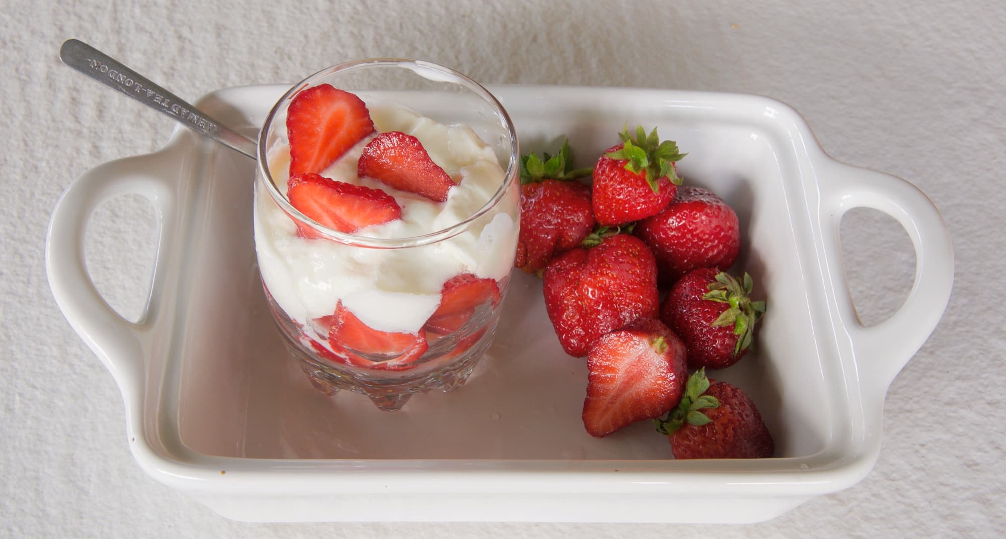 Если совсем просто, суть греческого йогурта в том, что из стандартного йогурта убирают некоторое количество сыворотки, загущая его таким образом. Мы сделали йогурт из фермерского молока и сухой йогуртной закваски, выдержали его в холодильнике не менее 6 часов, а затем аккуратно переложили ложкой на клубнику, нарезанную крупными кусками. Отправили в холодильник на пару часов, в течение которых сыворотка с йогурта стекла вниз в клубнику, а йогурт стал больше похож на густую плотную сметану. Далее мы слили сыворотку через край баночки, подсластили получившийся продукт и украсили ягодами.