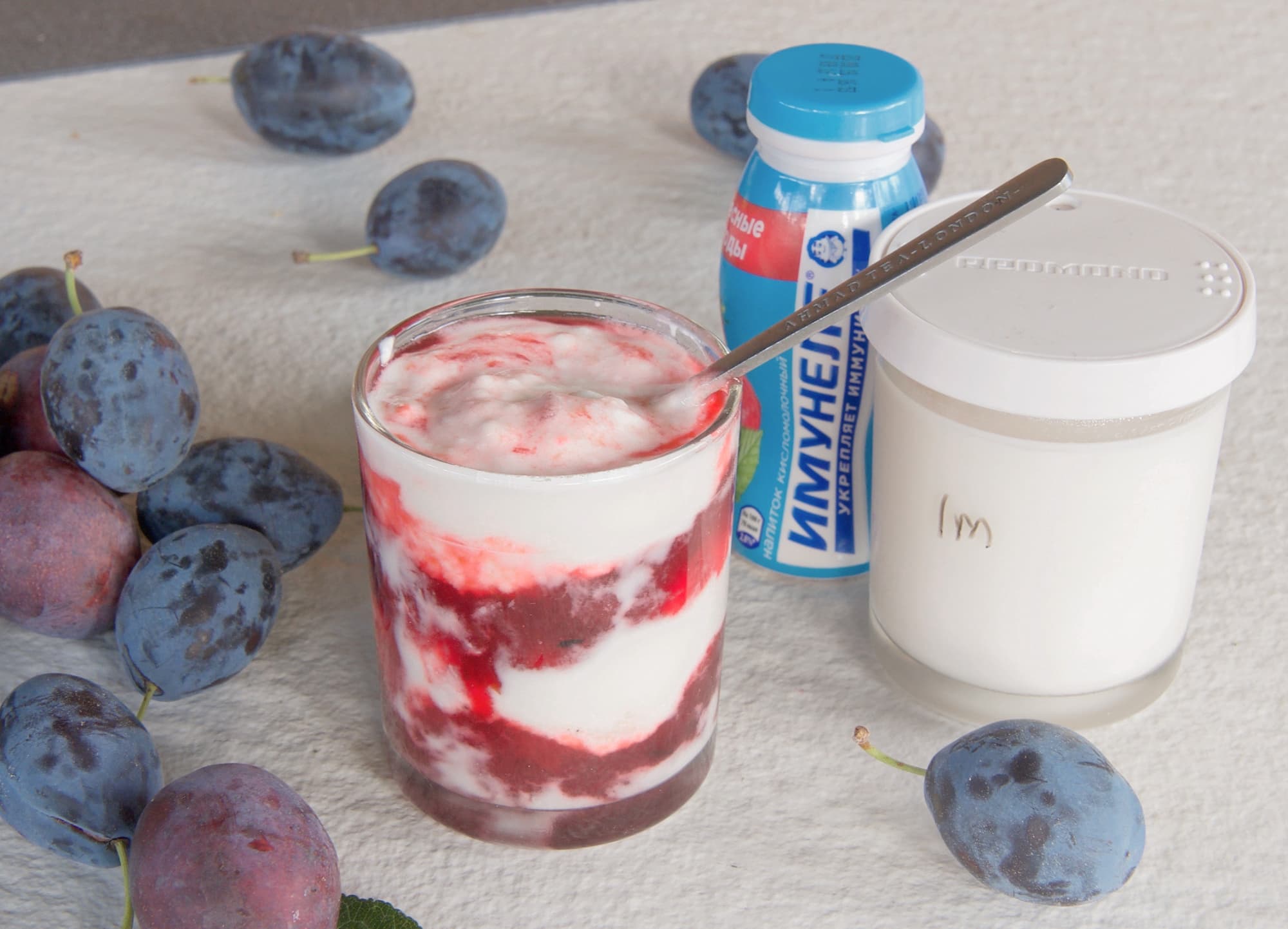 Мы взяли литр молока «Простоквашино» короткого срока хранения и бутылочку Имунеле. Смешали, не подогревая, разлили по бутылочкам, поставили в йогуртницу на 9 часов. Через 9 часов переставили в холодильник минимум на 6 часов. Йогурт получился достаточно плотный, с небольшими следами расслоения (точечными) снизу в трех баночках. Скорее всего это произошло из-за качества молока и отсутствия предварительного подогрева, но на вкусе не сказалось. В йогурт мы добавили сливовый джем и перемешали.