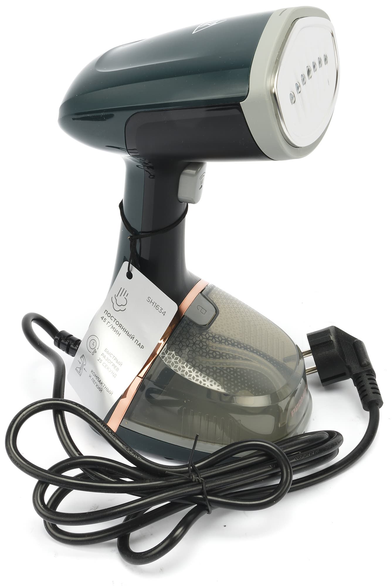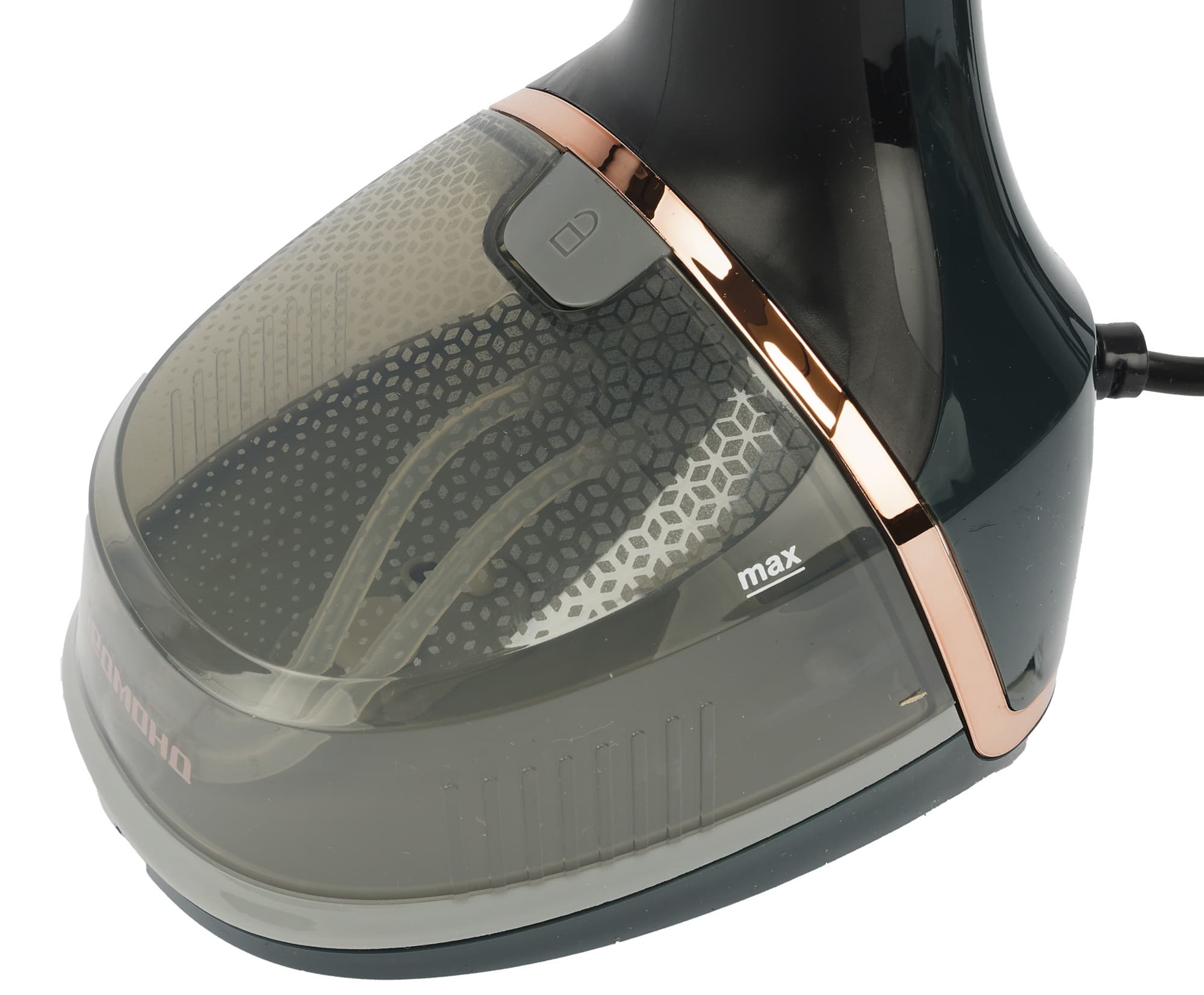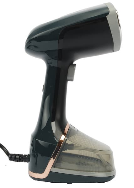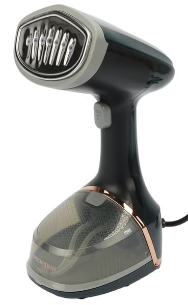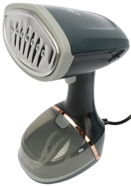 Корпус отпаривателя выполнен из темно-зеленого пластика, как производитель романтично называет его — темно-малахитового, с небольшим количеством пластиковых вставок золотистого, черного и серого цветов.