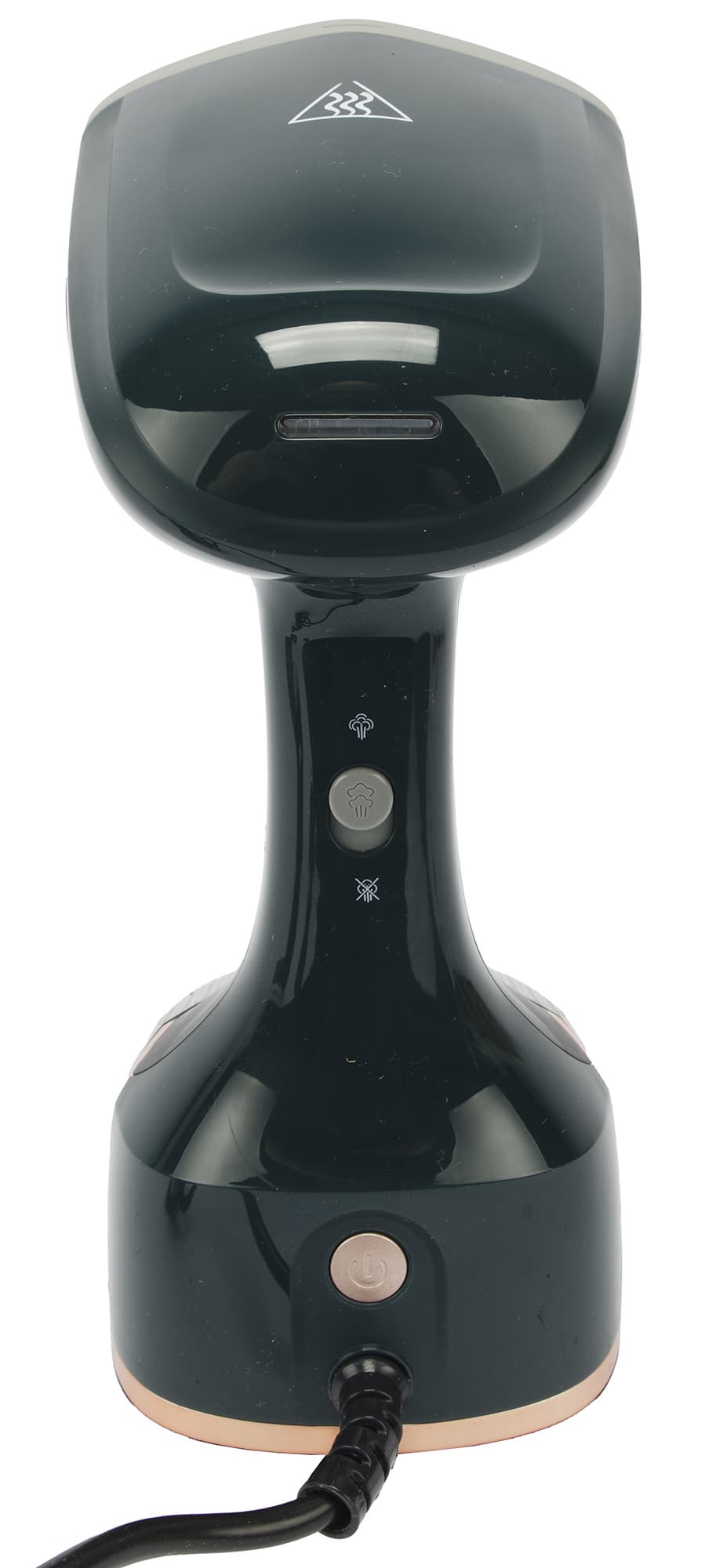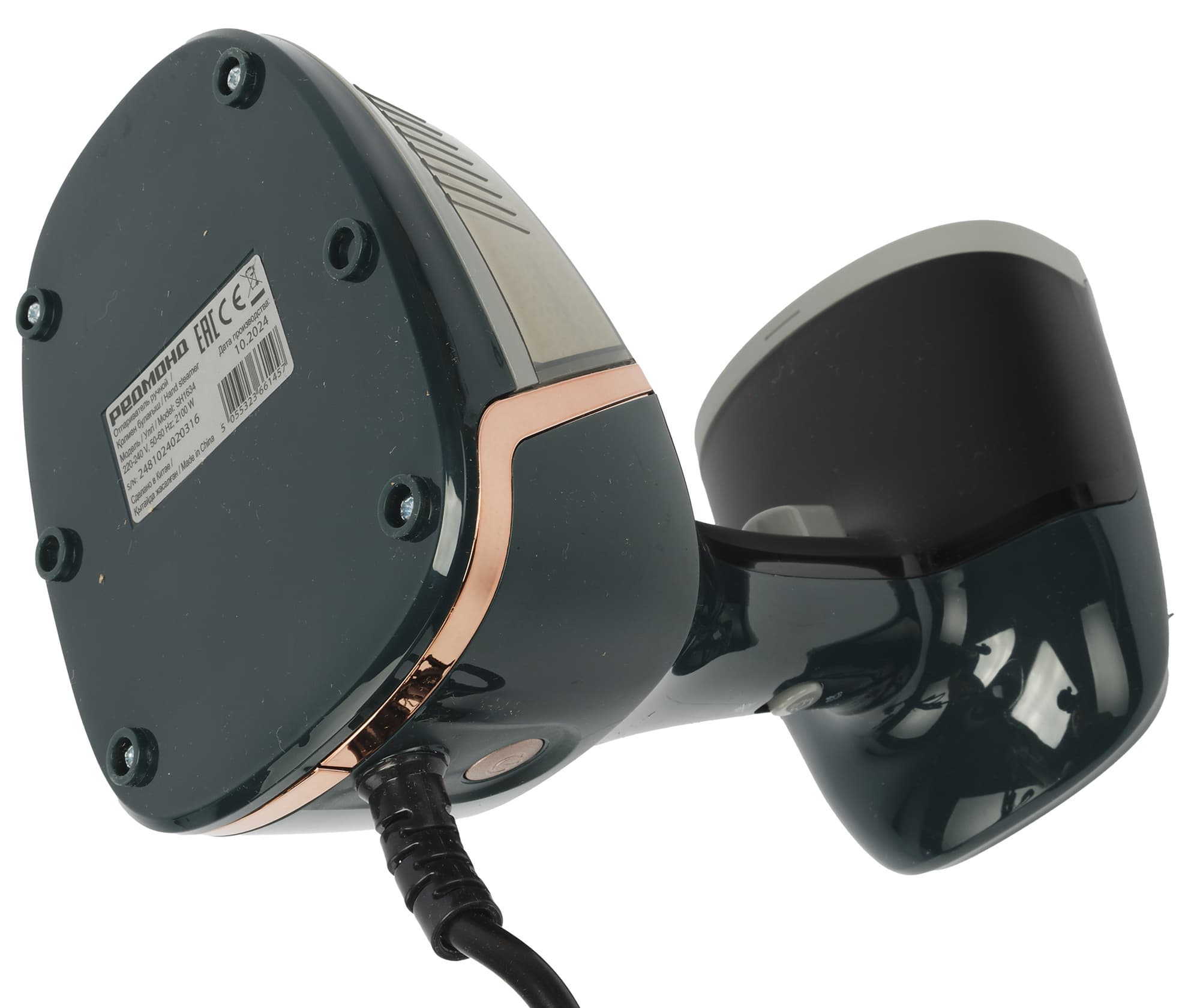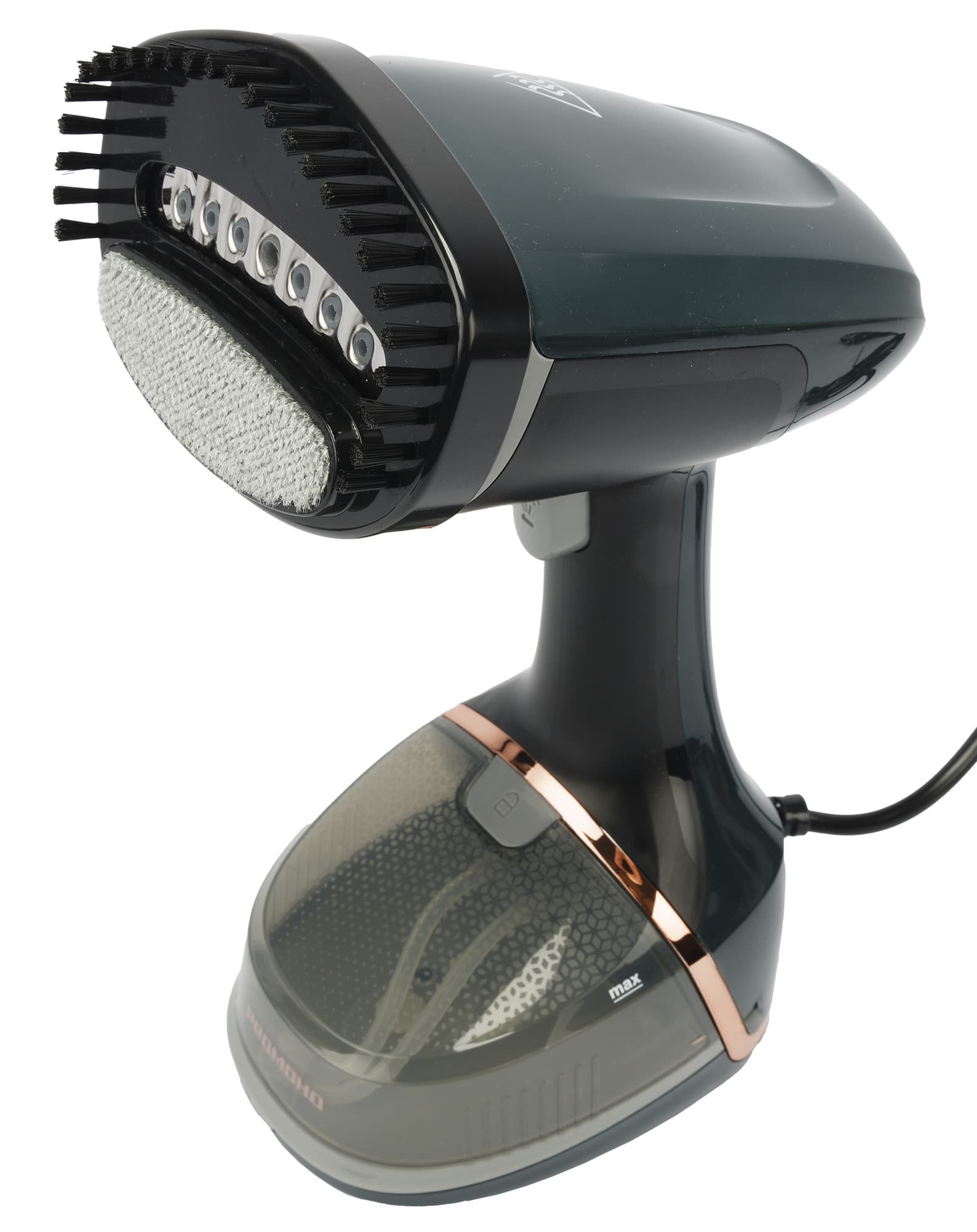 Корпус отпаривателя выполнен из темно-зеленого пластика, как производитель романтично называет его — темно-малахитового, с небольшим количеством пластиковых вставок золотистого, черного и серого цветов.