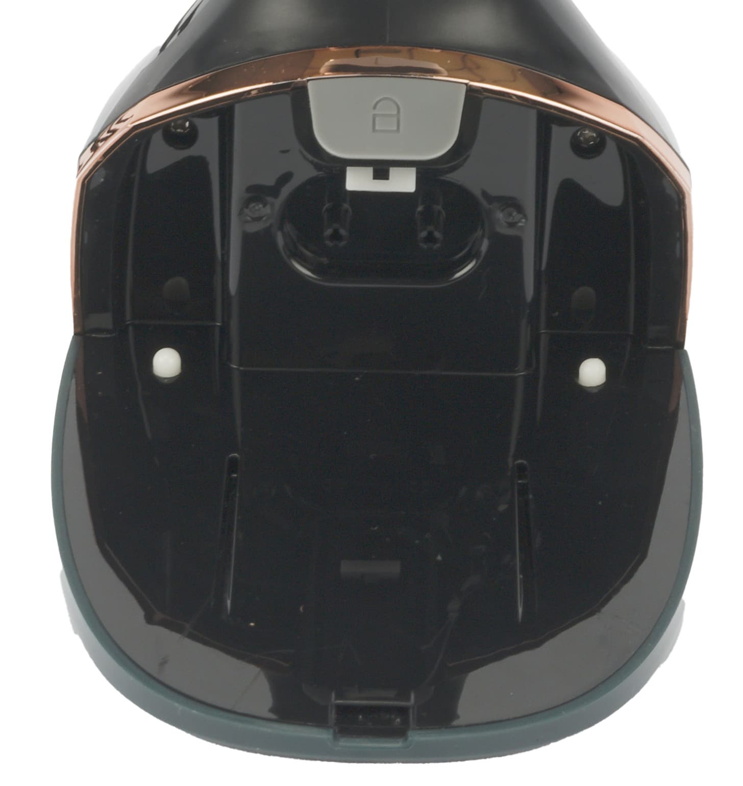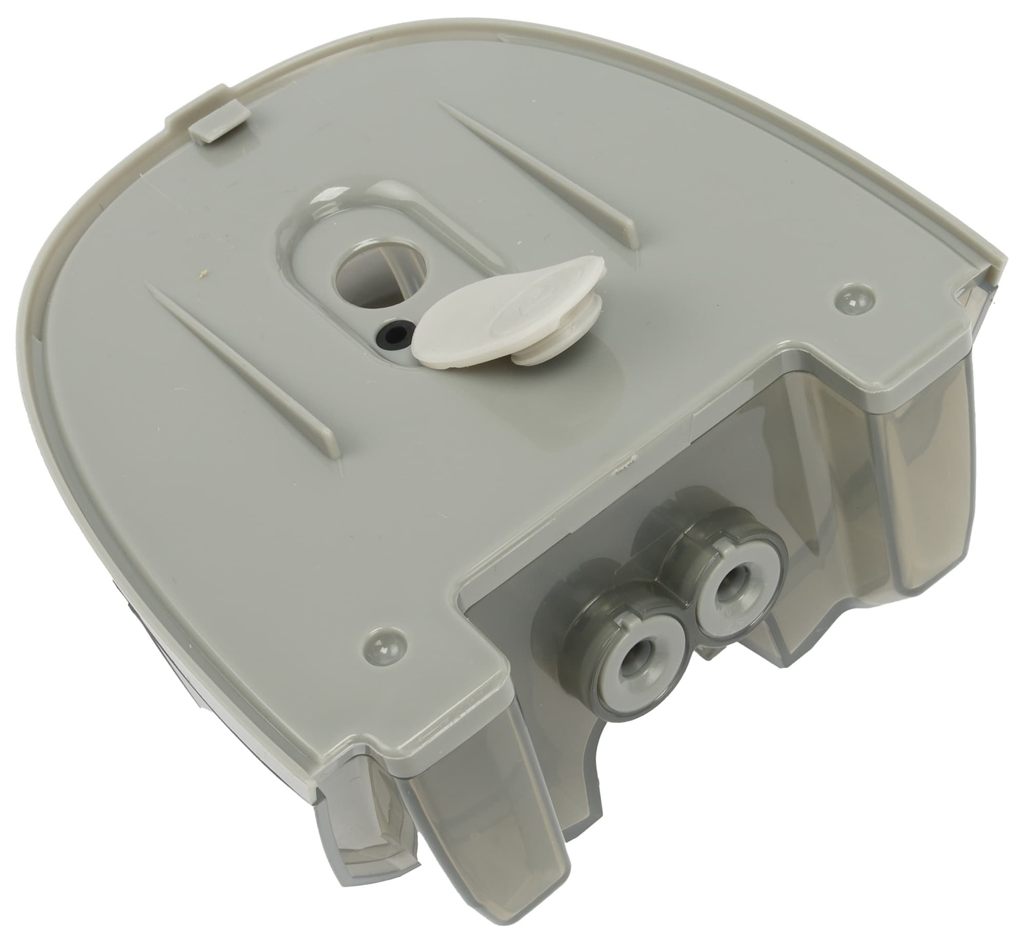 Внизу находятся две направляющие для выступов на резервуаре, а также две белые кнопки-фиксаторы, которые утапливаются при нажатии на кнопку разблокировки.