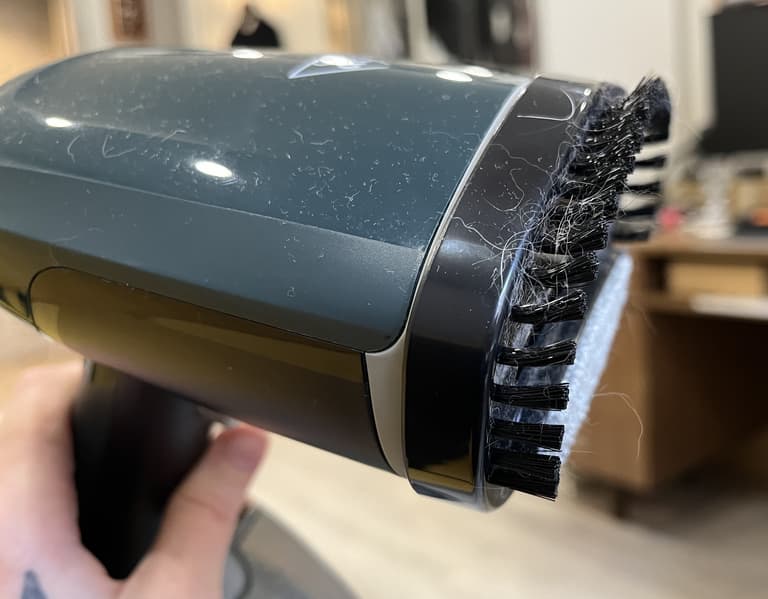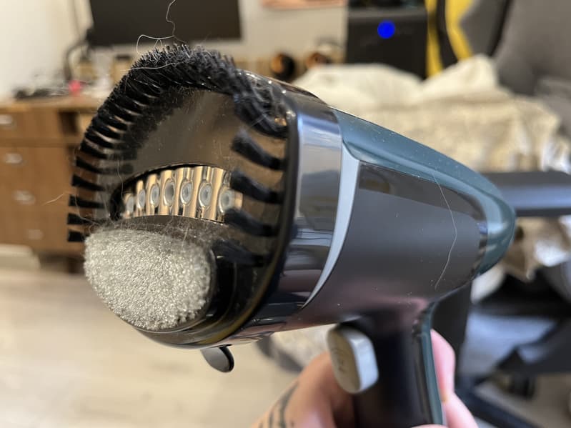 Щётка-насадка легко устанавливается на утюжок, прочно фиксируется и эффективно собирает пыль и мелкие загрязнения с ткани. Одновременно пар приподнимает ворс, что позволяет всего за пару минут очистить и освежить вещь.