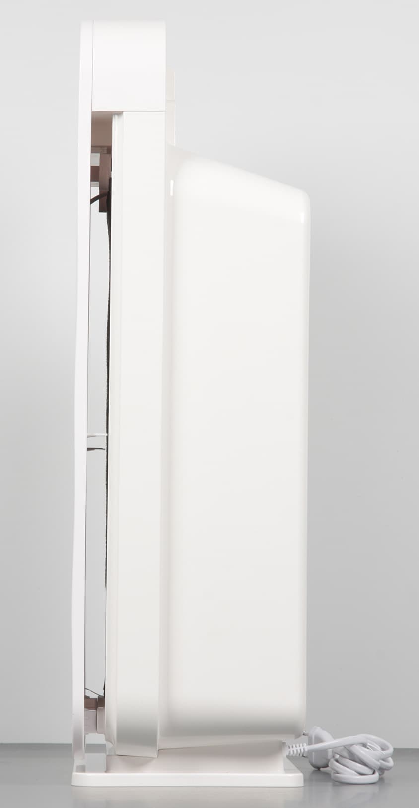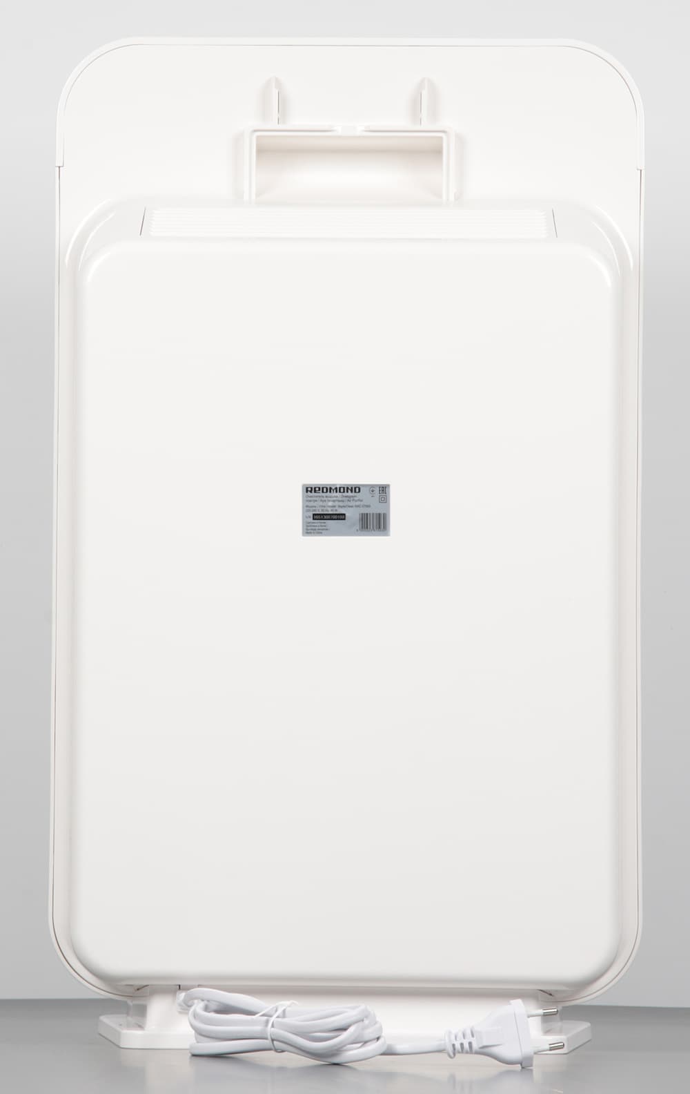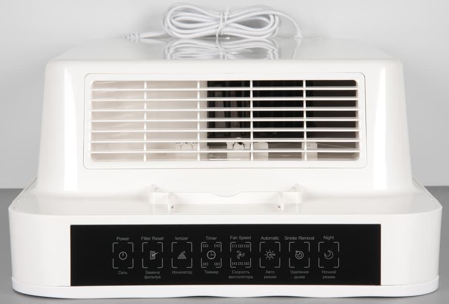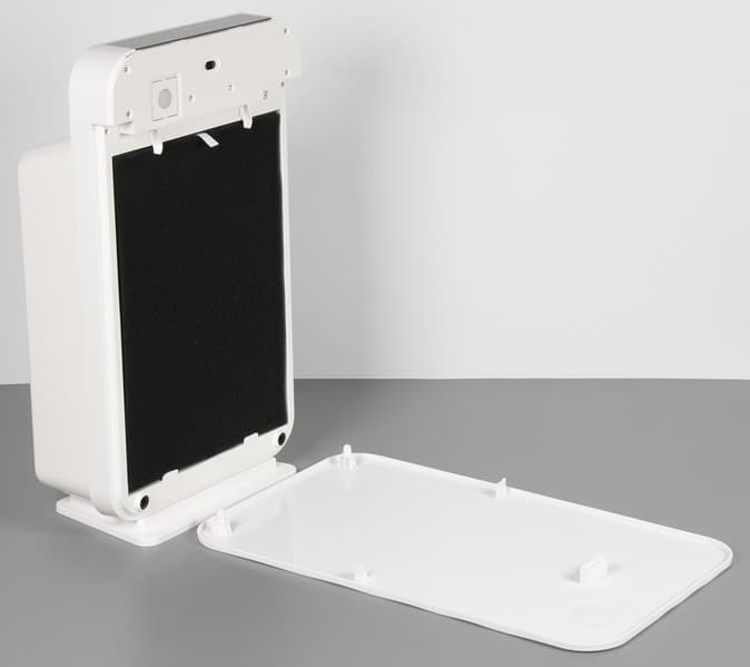 Вверху на задней панели присутствует ниша с окантовкой, являющаяся ручкой для переноски очистителя с места на место. На верхнем торце корпуса находится контрольная панель, а ниже сзади — выпускная решетка, направляющая поток воздуха вертикально вверх.