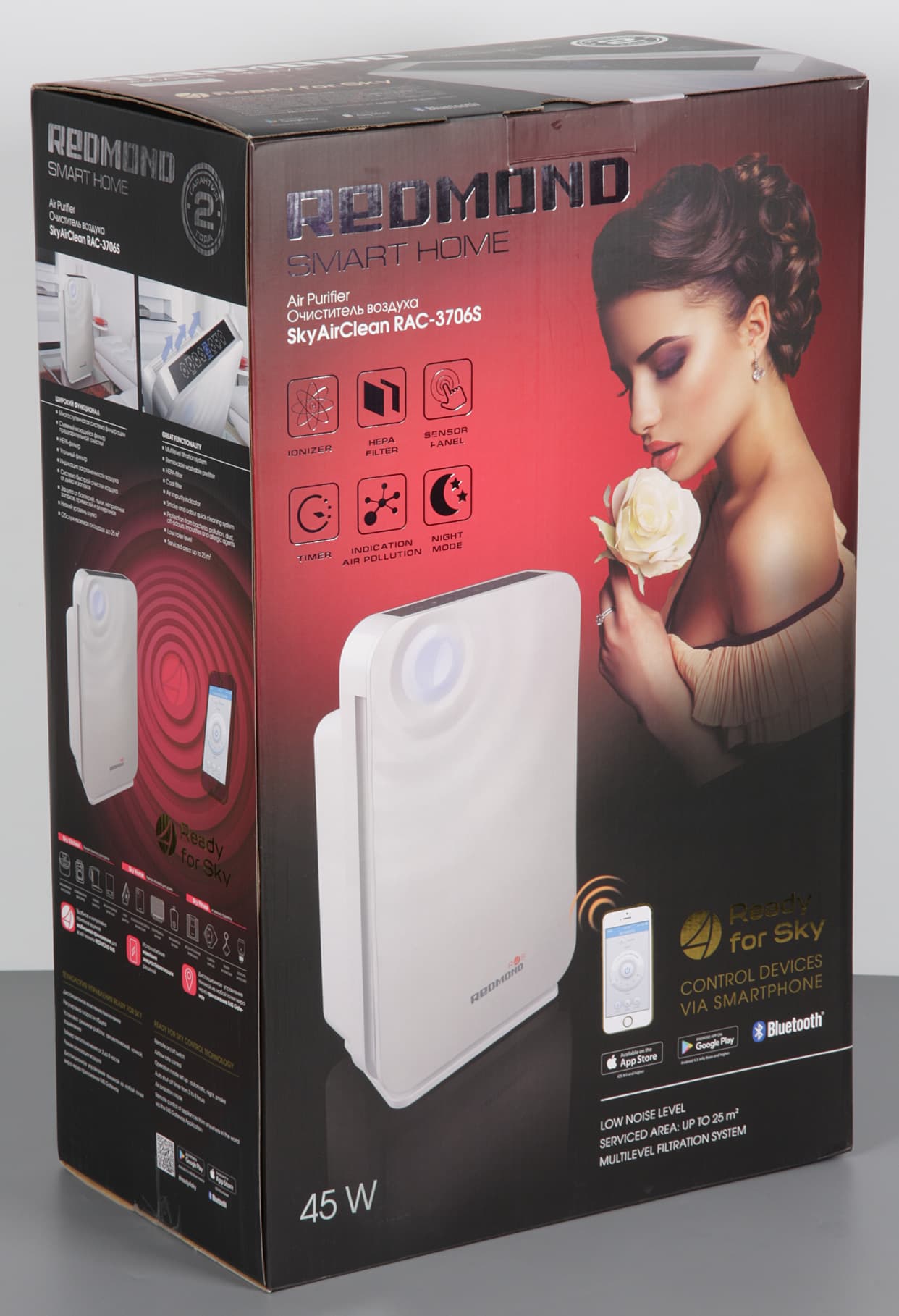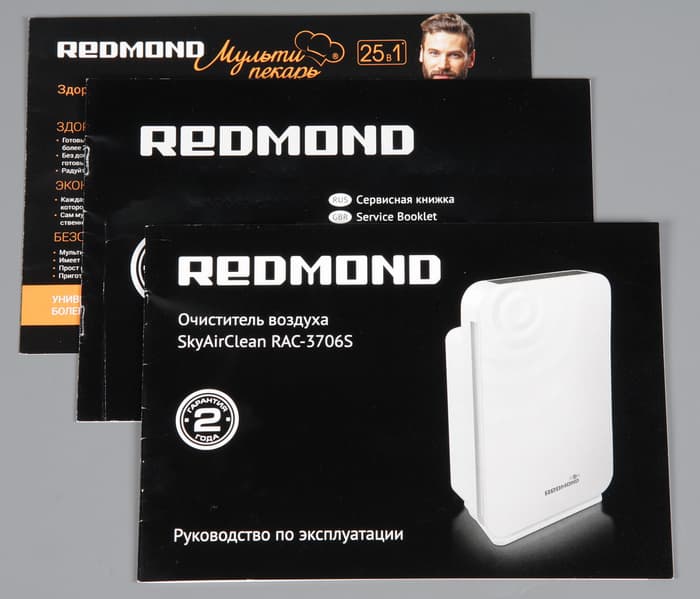 От воздействий превратностей транспортировки очиститель защищен вставками из пенопласта и пакетом из полиэтилена. На гранях коробки помимо женщины с розой изображены сам очиститель, смартфон с окном программы управления, очиститель в интерьере и контрольная панель, также есть текстовые блоки с перечислением особенностей и характеристик и описанием ПО Ready for Sky. Надписи преимущественно на английском и русском языках, но часть информации представлена еще на нескольких языках. В комплект поставки входит один первоначальный набор фильтров, руководство по эксплуатации (русский язык присутствует), сервисная книжка и рекламная листовка. Качество печатных материалов высокое.