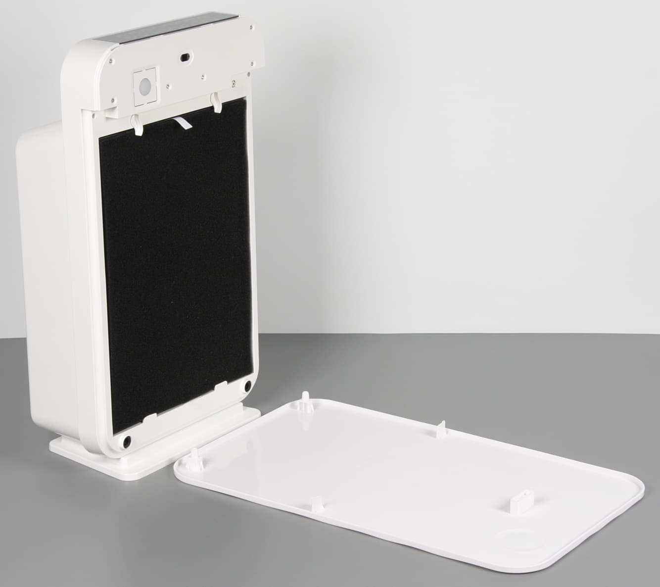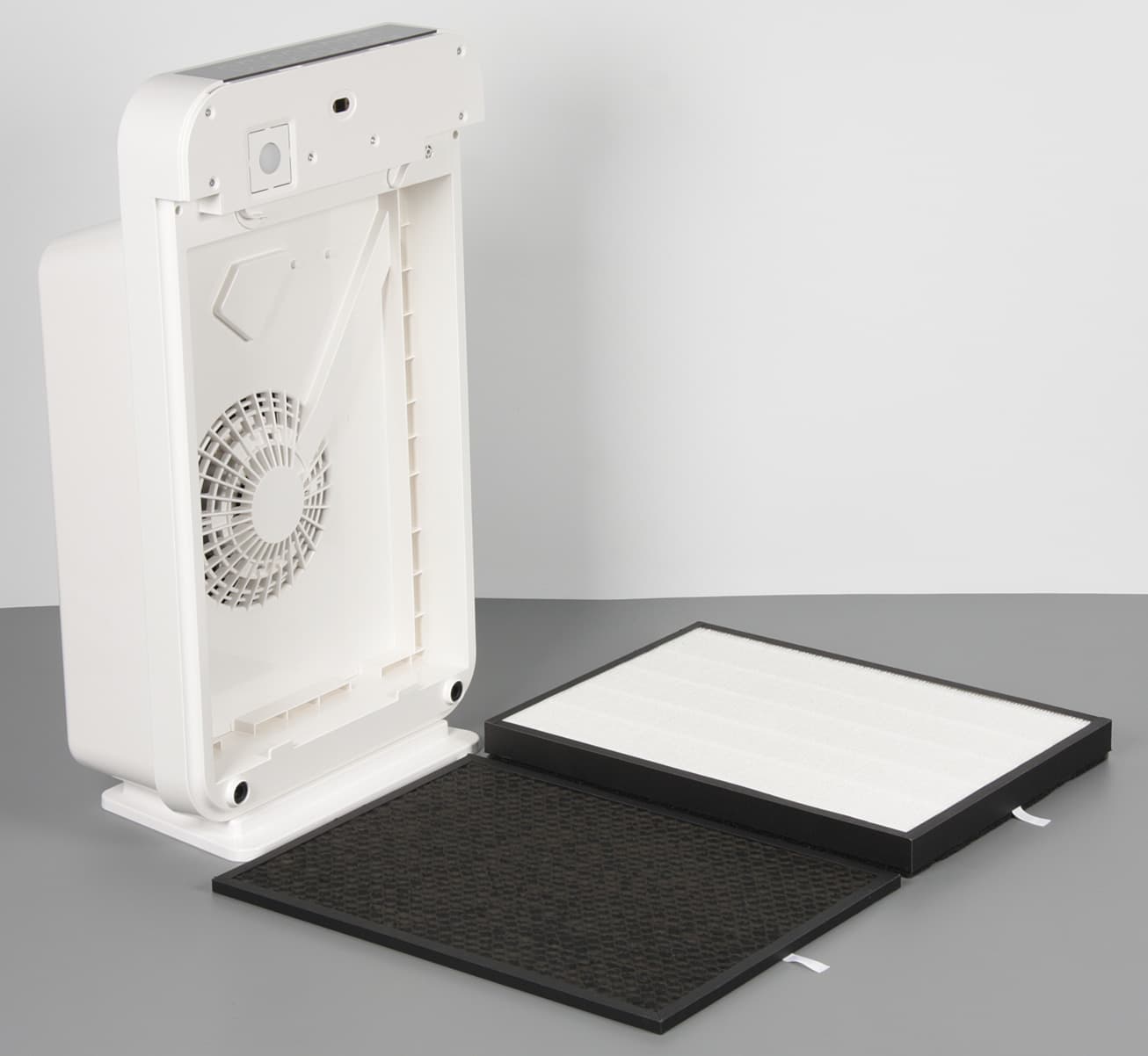 Никаких специальных герметизирующих прокладок и уплотнений нет, фильтры просто вставляются в отсек и удерживаются снизу выступами на корпусе, а сверху — поворотными фиксаторами. По центру отсека для фильтров расположена входная решетка вентилятора. Выше, уже над отсеком, фронтальная крышка прикрывает отверстие датчика загрязненности воздуха и круглый светорассеиватель индикатора загрязненности. Свет от этого индикатора просвечивает сквозь фронтальную крышку в том месте, откуда расходятся волны на поверхности крышки.