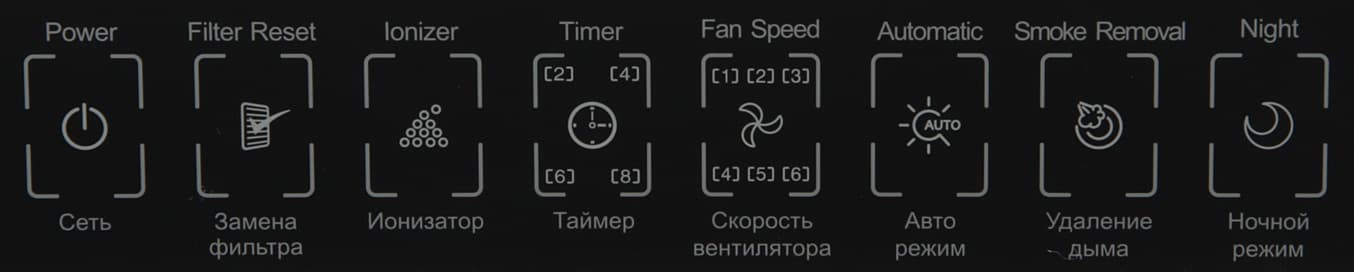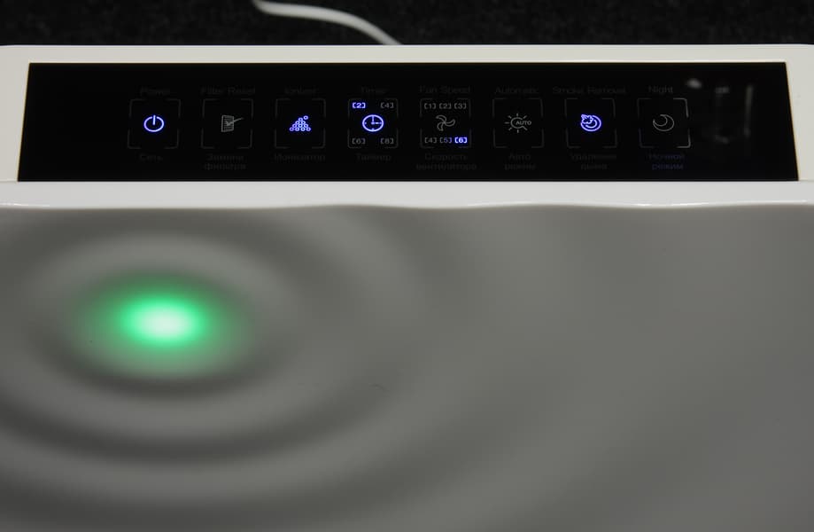 Также можно включить ночной режим, в котором не только вентилятор работает на минимальной скорости, но и из всех индикаторов светится только значок полумесяца. К работе сенсорных кнопок нет никаких претензий. Замечено, что индикатор качества воздуха меняет свой цвет от зеленого (чистый воздух) до красного (очень грязный воздух). Из дополнительных функций отметим наличие ионизатора (включается-выключается отдельной кнопкой), который насыщает воздух отрицательными ионами, а также таймер на 2, 4, 6 или 8 часов на выключение. Кнопка Удаление дыма фактически просто сразу переключает вентилятор на максимальную скорость. Отдельная кнопка-индикатор подскажет, когда нужно произвести замену фильтра и позволит сбросить счетчик фильтра, после установки нового фильтра. Кнопка Скорость вентилятора позволяет вручную регулировать скорость фильтрации (6 ступеней). В автоматическом режиме скорость фильтрации регулирует сам очиститель, видимо, в зависимости от текущего уровня загрязнения, по крайней мере, когда воздух чистый, то скорость в автоматическом режиме минимальная. Если выключить очиститель кнопкой на контрольной панели (фактически перевести его в режим ожидания), то на контрольной панели не будет никакой индикации. Это неудобно, так как нельзя сразу определись, что очиститель подключен к сети. Если включить очиститель, и не важно был ли перерыв в подаче питания или нет, все равно будет включен ионизатор и выбрана третья скорость вентилятора, то есть режимы работы очиститель не запоминает, что также не очень удобно.