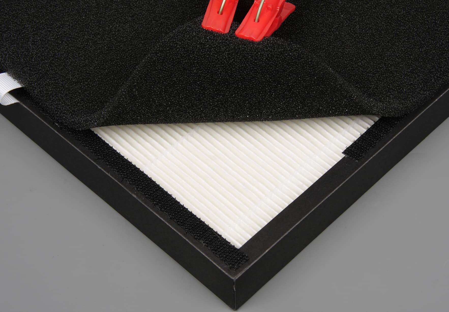 Крупные частицы задерживаются на первом рубеже — на поролоновом фильтре, удерживаемым полосками с «липучкой» на рамке HEPA-фильтра.