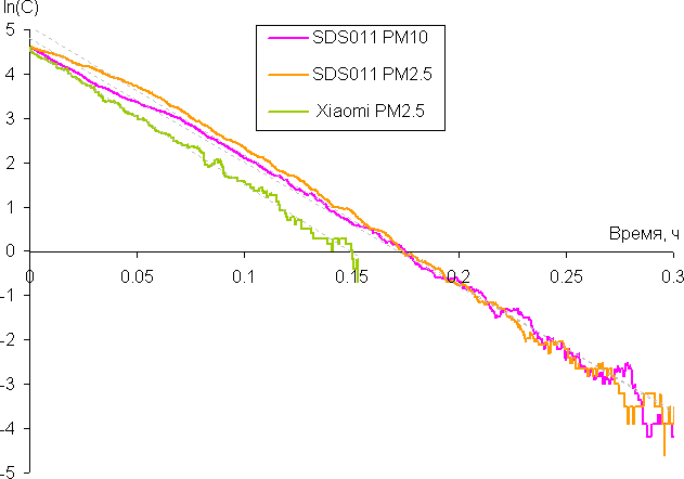 Отметим, что в случае датчика SDS011 в области высоких концентраций зависимость не была линейной, видимо, датчик занижал значения концентрации. Поэтому для расчета коэффициентов нелинейный участок отбрасывался. Умножив полученный коэффициент на объем помещения, получим скорость фильтрации. Результат приведен в таблице ниже.