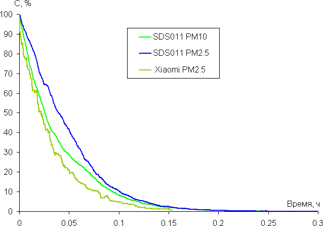 Мы провели оценочное тестирование скорости очистки воздуха. Описание методики приведено в этой статье. На графике ниже показана относительная концентрация дыма от времени после снижения концентрации дыма до верхнего предела, определяемого данным видом датчика. Использовались датчики Xiaomi PM2.5 Detector Air Quality Monitor, который, по всей видимости, показывает концентрацию частиц класса PM2.5 в мкг/м³, а также датчик SDS011, передающий показания, соответствующие концентрации частиц PM2.5 и PM10. За 100% принят верхний предел каждого датчика, а именно 600 мкг/м³ (PM2.5) в случае Xiaomi, 1000 мкг/м³ (PM2.5) и 2000 мкг/м³ (PM10) в случае SDS011. То есть в абсолютных значениях концентрации и времени эти зависимости отвечают немного различающимся значениям концентрации частиц и временным интервалам. Укажем, что объем тестового помещения в данном тесте составил 8 м³.