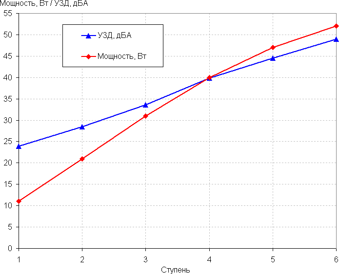 Уровень шума мы измеряли при размещении Redmond SkyAirClean 3706S на полу в вертикальном положении. Микрофон шумомера размещался на высоте 1,2 м от пола (примерно на высоте уха сидящего на стуле человека), на расстоянии 1 м сбоку от фронтальной панели очистителя и был направлен на него. На графике ниже приведены взвешенные значения уровня звукового давления и значения потребляемой мощности для шести степеней мощности.