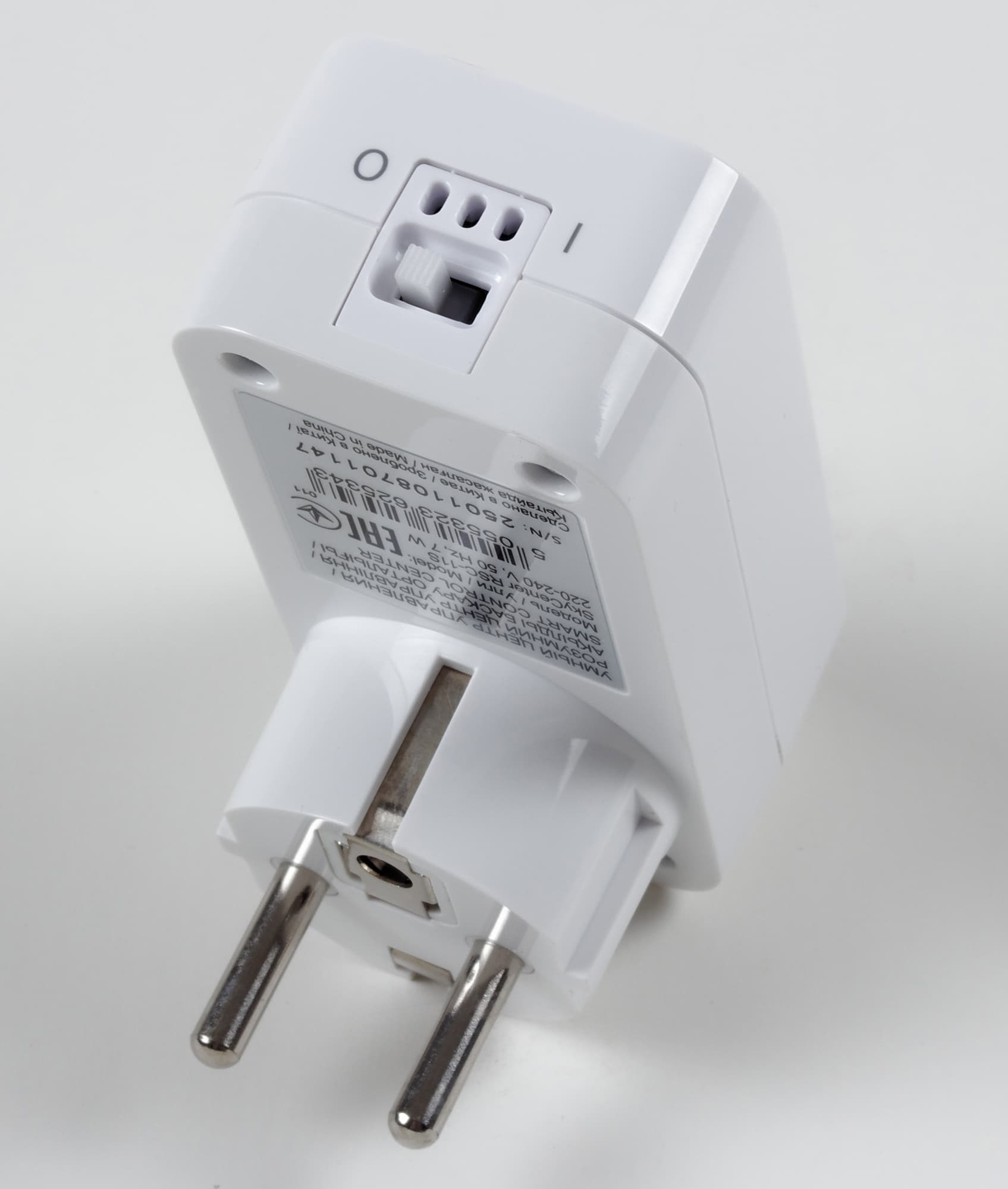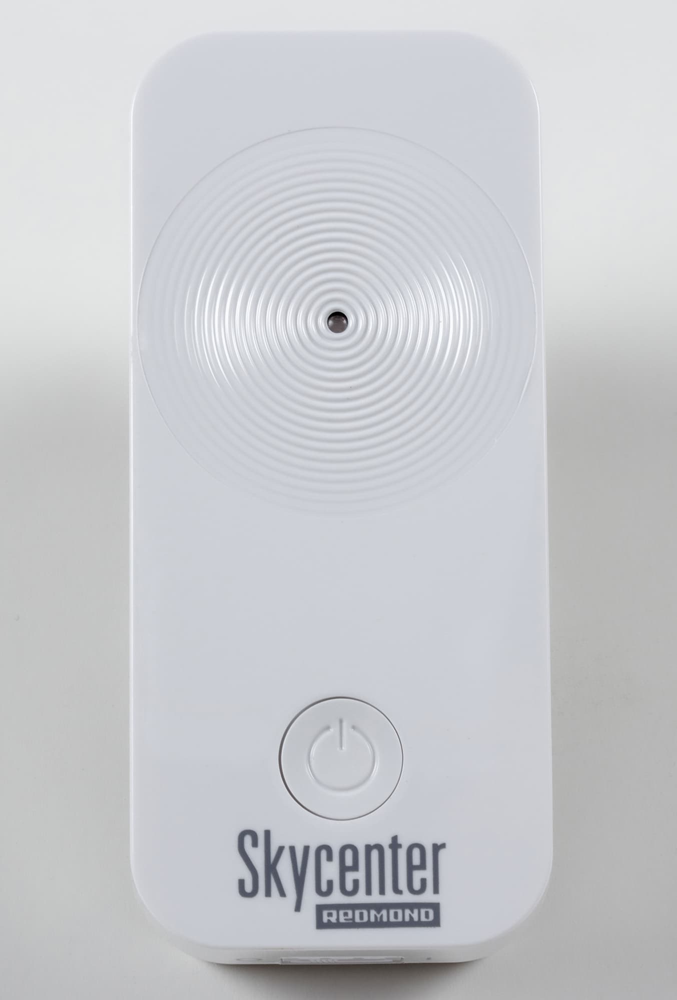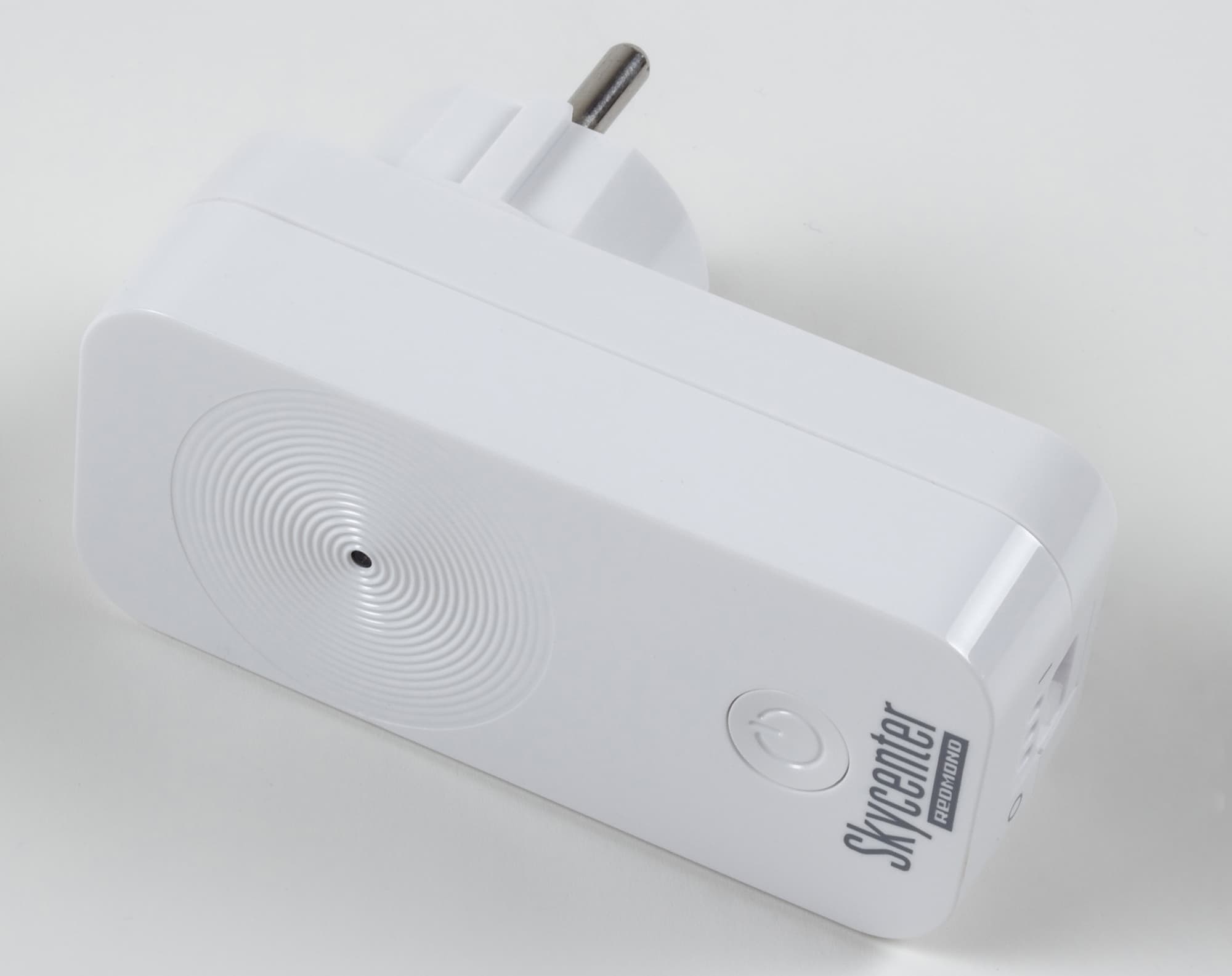 Redmond SkyCenter RSC-11S сделан из белого гладкого пластика. Это параллелепипед со скругленными углами, на передней стороне которого есть выступ — вилка для обычной электрической розетки, а с задней белая кнопка управления и светодиод в симпатичном узоре из концентрических кругов.