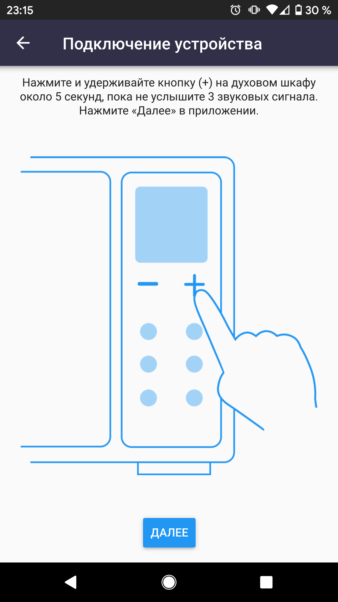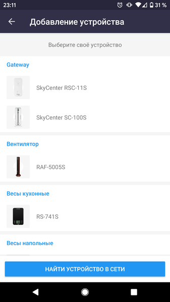 Итак, мы подключили умный центр к приложению, а теперь надо подключить к умному центру другие устройства. Для этого их надо найти. У нас на тестовой кухне стояла совместимая с RSC-11S духовка SkyOven 5717S, которую мы и нашли в списке доступных устройств.