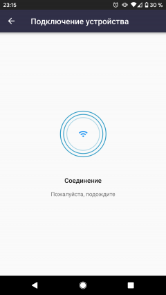 Когда мы нажали на строку устройства, нам предложили подключиться к уже нашему источнику Wi-Fi. Затем приложение в очередной раз, уже снаружи, нашло RSC-11S. Если тапнуть на эту строку, то после некоторого ожидания приложение сообщит, что успешно подключилось к устройству и оповестит об окончании настройки. Для того, чтобы окончательно завершить процесс, приложение просит проверить состояние индикатора на приборе: горит, мигает или не горит. Конкретно в момент демонстрации этого экрана индикатор не горит, но если нажать кнопку «Ясно», то он загорится.