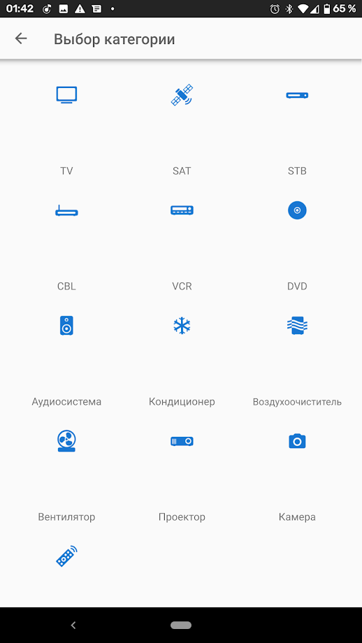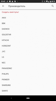 Нажав на кнопку «добавить пульт», мы попадаем в меню выбора категорий устройств. На этом этапе нас ожидало разочарование. Из тринадцати категорий устройств, среди которых значатся DVD-плееры, аудиосистемы, системы спутникового телевидения и многое другое, список предустановленных в приложении производителей техники имелся только в категории «телевизоры». Приложению известно всего тринадцать изготовителей телевизоров, и большая часть их списка помещается на одном экране.