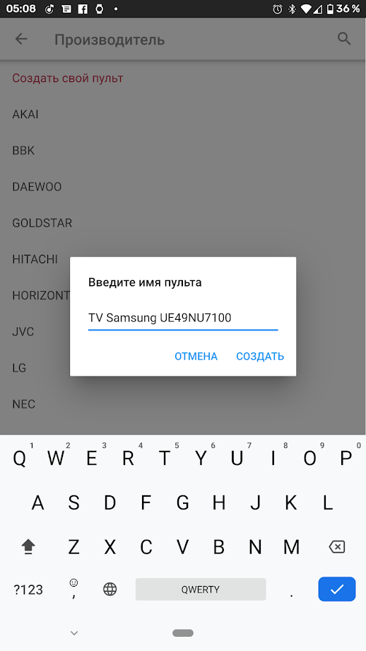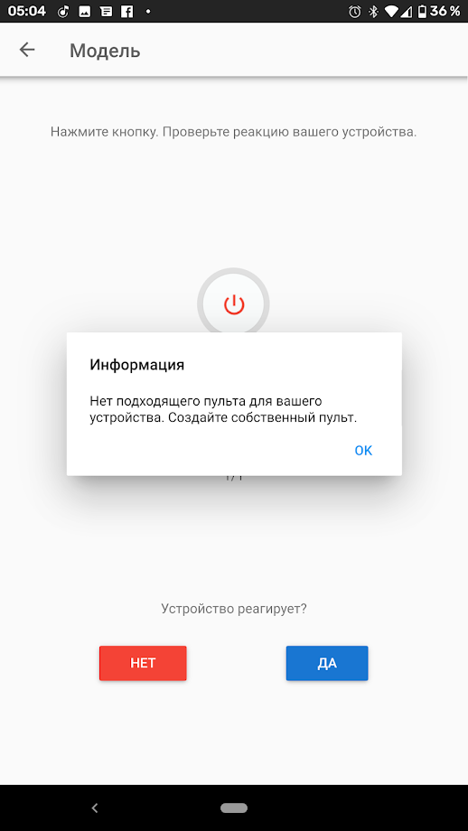 Приложение предложило нам нажать кнопку включения устройства на экране и проверить, заработал ли наш телевизор. После отрицательного ответа мы получили рекомендацию создать пульт вручную. Впоследствии мы попробовали найти предустановленные в приложении пульты для почти десятка различных телевизоров Samsung, Panasonic, LG и JVC, но результат оказался одним и тем же. Придется создавать вручную...