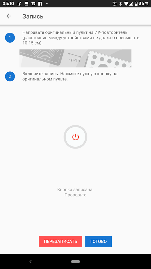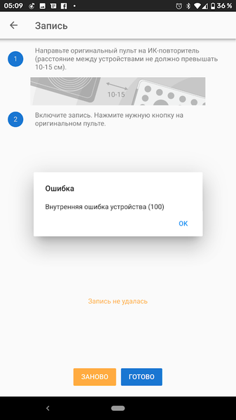 Довольно сложно оказалось и выбрать продолжительность нажатия на кнопку пульта при записи команды. Нажатие должно быть не слишком длинным, но и не слишком коротким, иначе приложение выдаст сообщение о внутренней ошибке, и процесс записи придется повторять.