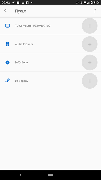 Мы добавили в приложение пульты трех компонентов домашнего медиацентра: телевизора, DVD-плеера и аудио-ресивера. Однако через некоторое время оказалось,что переключаться между тремя экранами в приложении почти так же неудобно, как управлять устройствами при помощи трех оригинальных пультов, и мы добавили четвертый, назвав его «Всё сразу».
