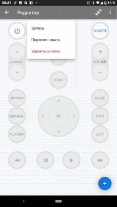 На панель виртуального пульта мы добавили наиболее часто используемые функции телевизора. Для каждой из них доступно меню записи. Чтобы внести в память пульта SkyControl код кнопки, требуется поднести к смартфону оригинальный блок управления устройством, выбрать «начать запись» в приложении и нажать нужную клавишу на физическом пульте. Получив код команды, виртуальный издает подтверждающий писк и сообщает об успехе операции на экране приложения.