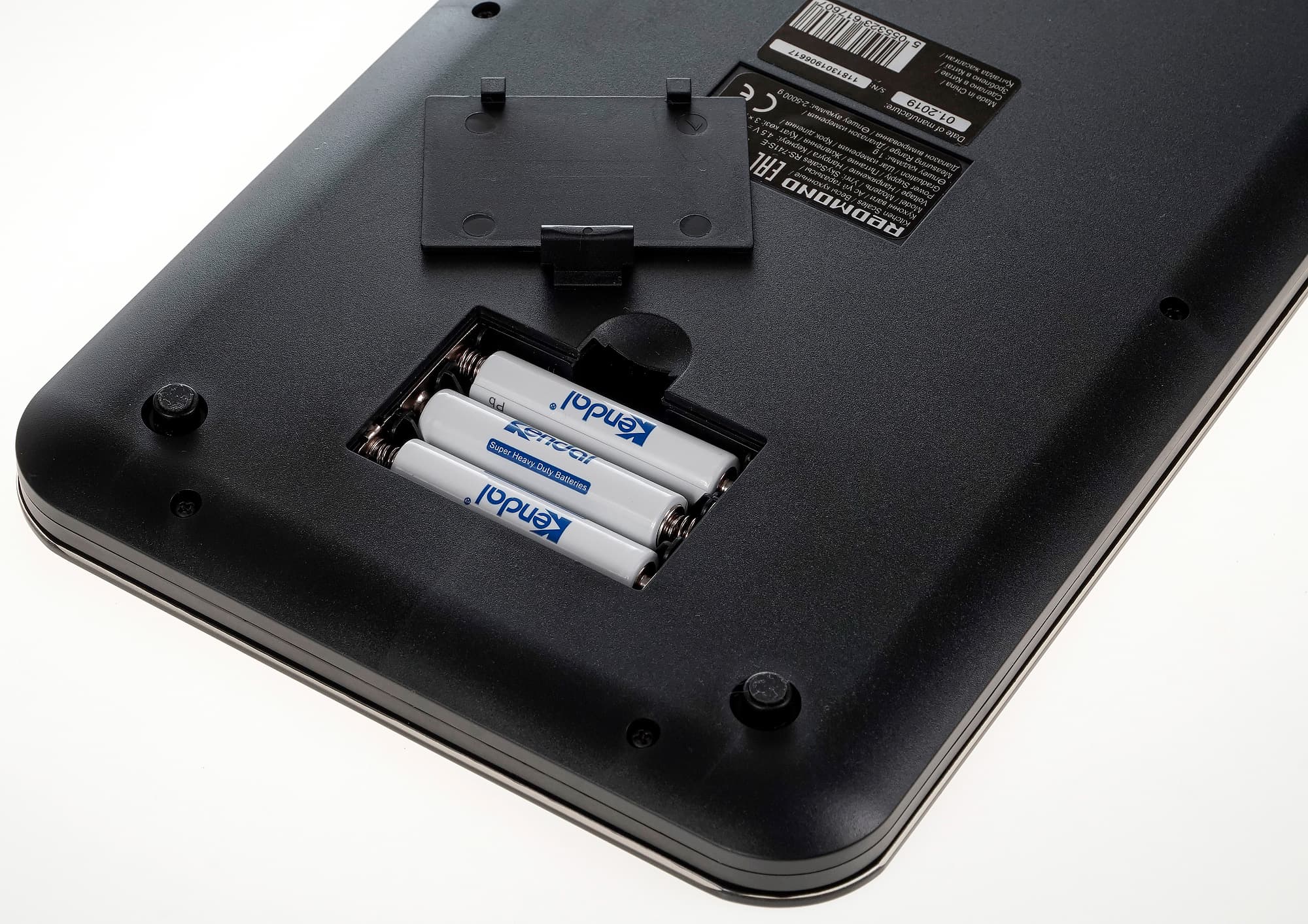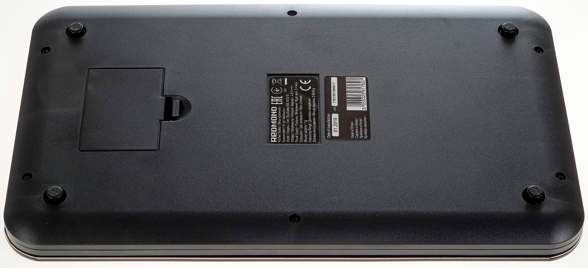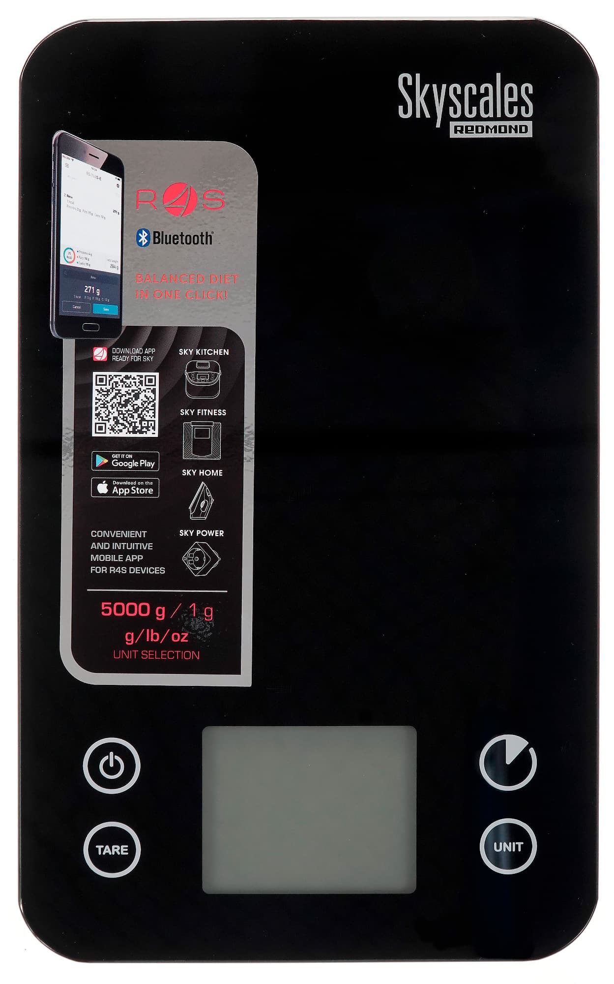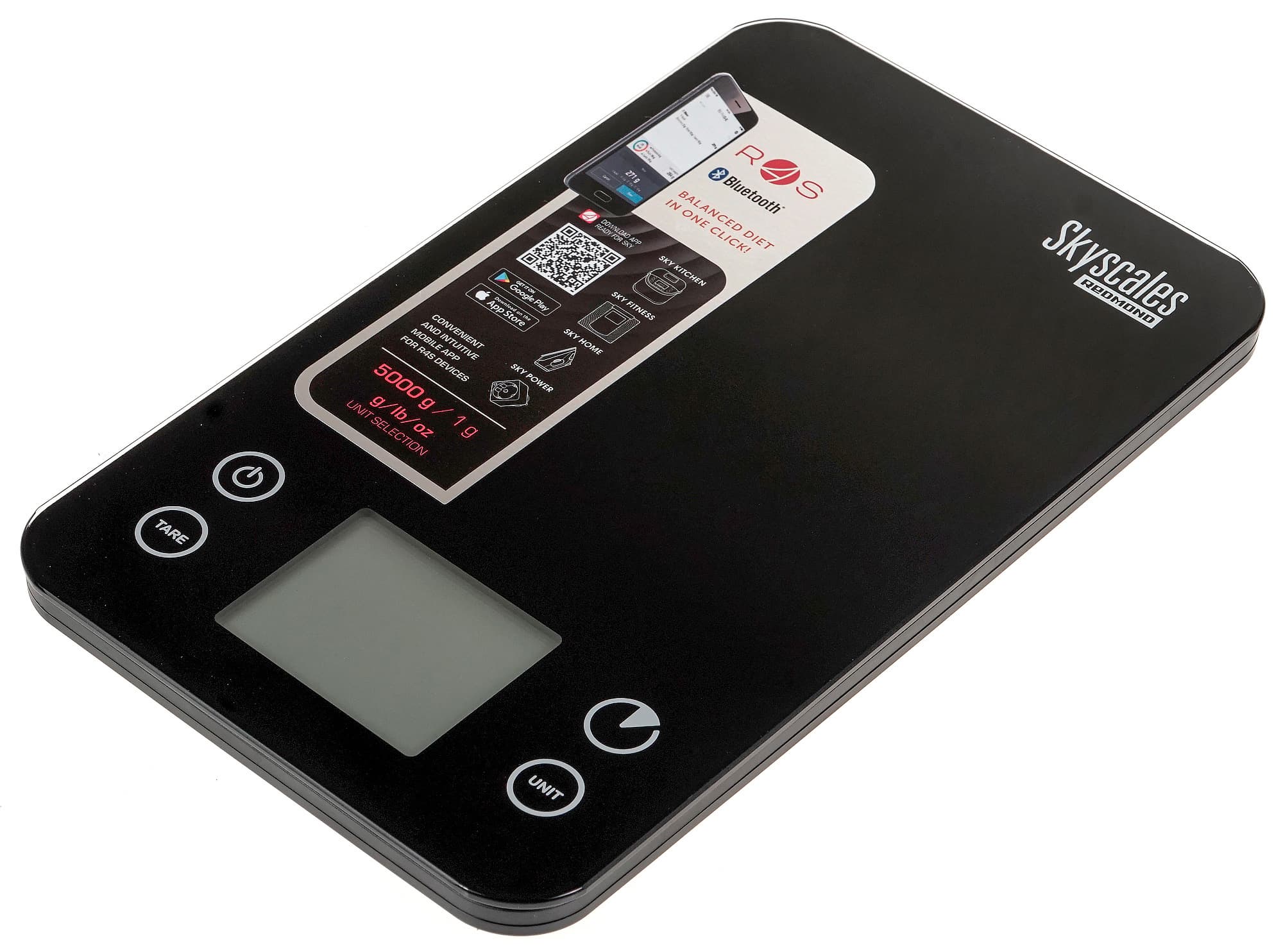 На панели имеется наклейка с рекламой приложения Ready for Sky и QR-кодом для его скачивания. Также на ней есть напоминание о том, что весы взвешивают от 2 до 5000 г с точностью до 1 г и могут переключаться между граммами, фунтами и унциями. Наклейка приклеена весьма основательно, поэтому мы решили ее не снимать.