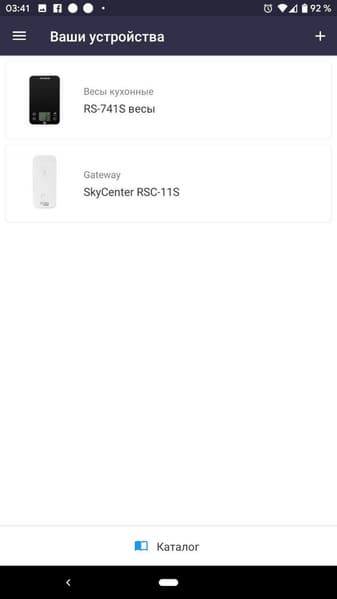 После того, как весы синхронизировались со смартфоном, мы выбираем их в списке доступных в Ready for Sky устройств и попадаем в список взвешиваемых продуктов. Изначально он пуст.