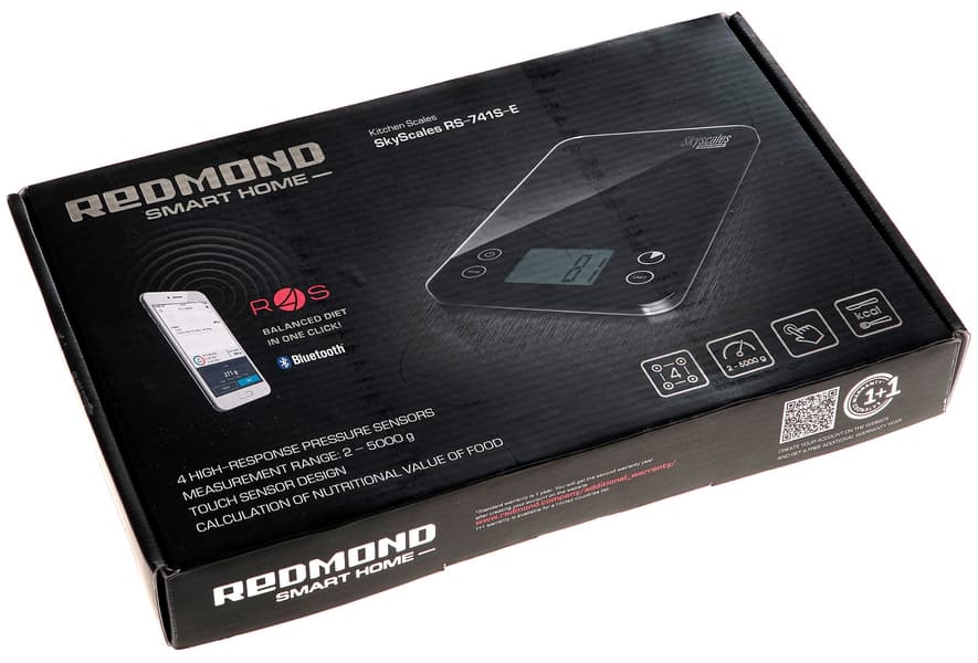 На крышке черной плоской коробки нарисованы стильные черные же весы (нет, не сливаются с фоном, респект дизайнеру) и смартфон, испускающий в сторону весов Bluetooth-волны. Пояснение рядом гласит, что соединение с помощью программы Ready for Sky обеспечивает потребителю сбалансированную диету в один клик.