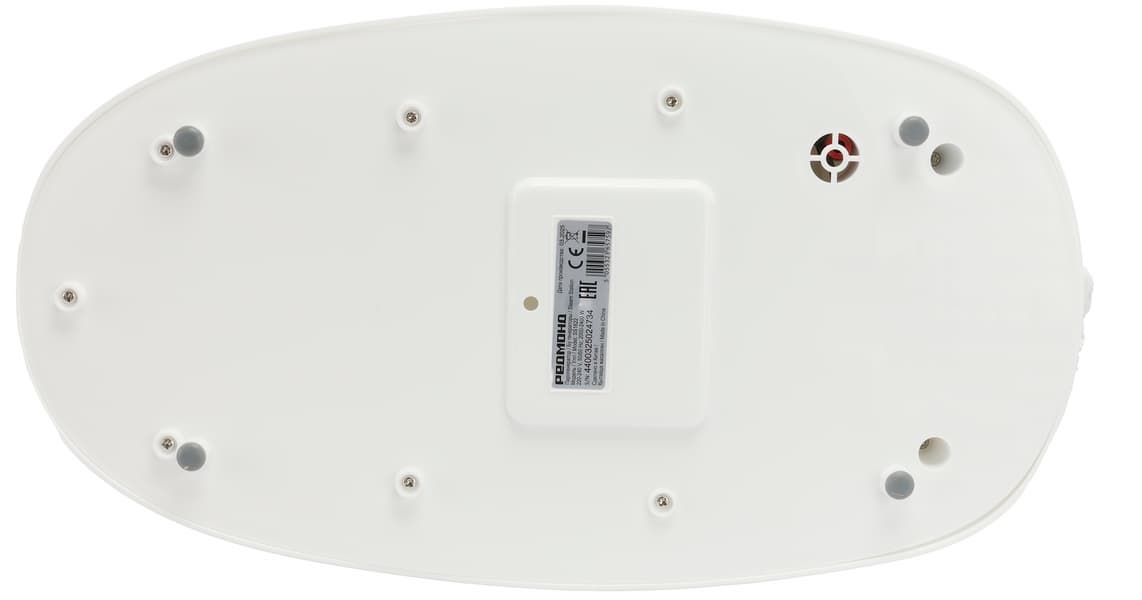 На дне основания находится несколько вентиляционных отверстий, четыре противоскользящие ножки и шильдик с краткой технической информацией о приборе.