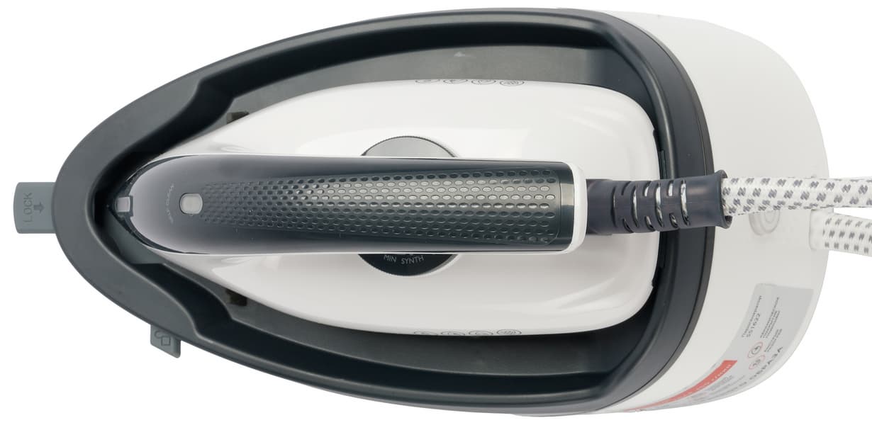 Пластиковый фиксатор носика утюга помимо стандартного положения, в котором он слегка ограничивает движение утюга, может еще и полностью его блокировать. Для этого сверху нужно нажать на механическую кнопку и тем самым опустить блокиратор на носик. Для разблокировки потребуется нажать кнопку с изображением открытого замка, которая находится сбоку корпуса.