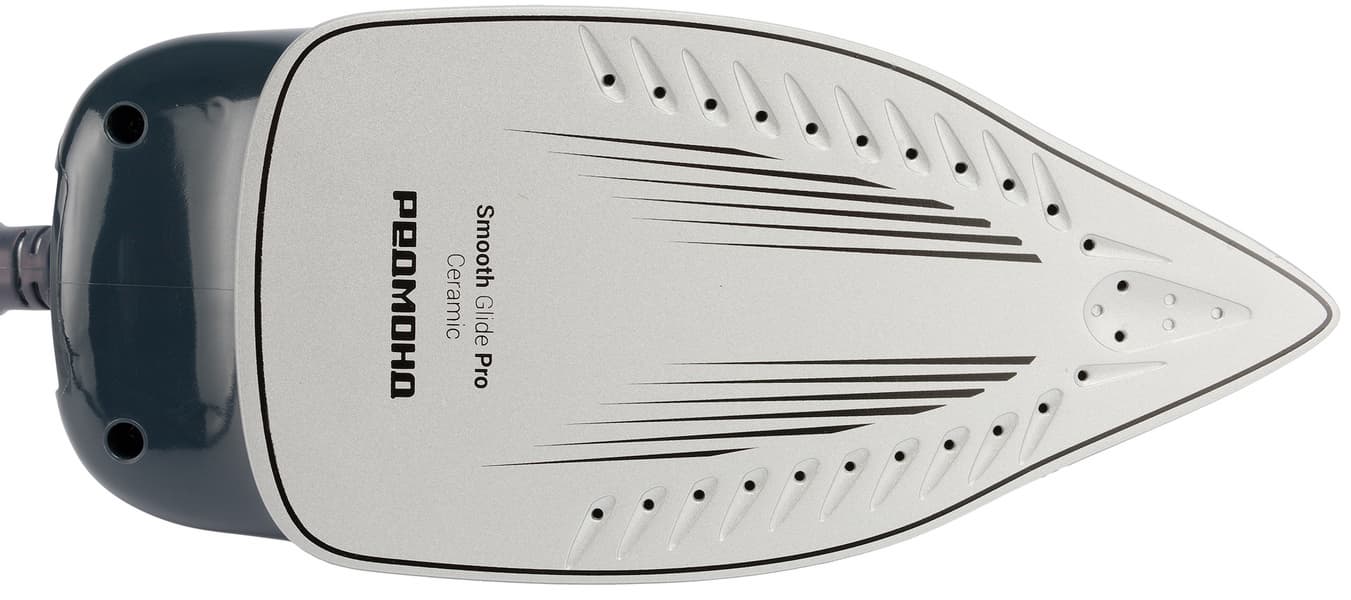 Подошва утюга обработана керамическим антипригарным покрытием Smooth Glide Pro. Отверстия для выхода пара расположены на носике, а также расходятся вдоль боковых граней подошвы.