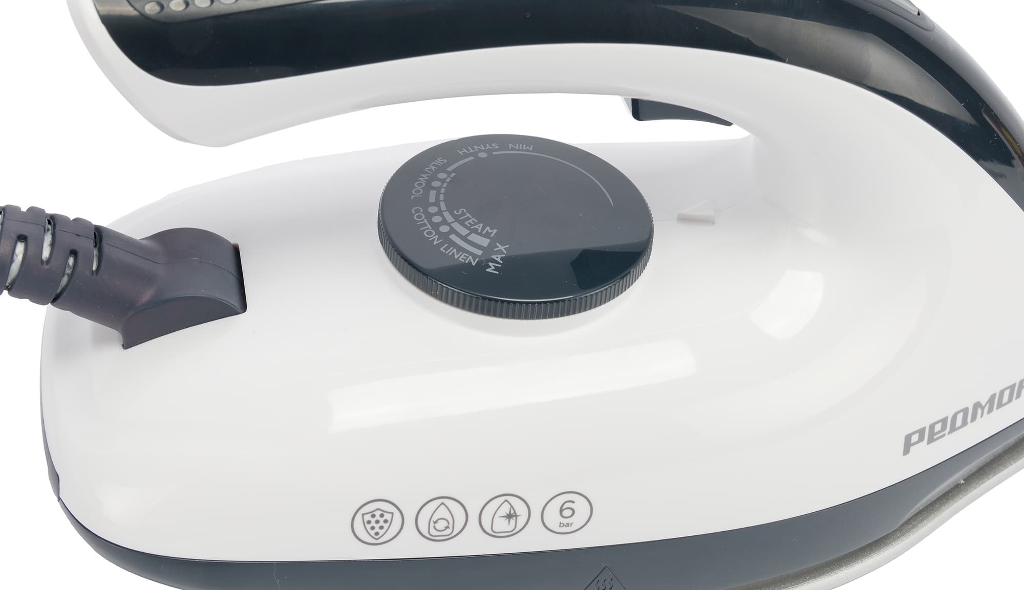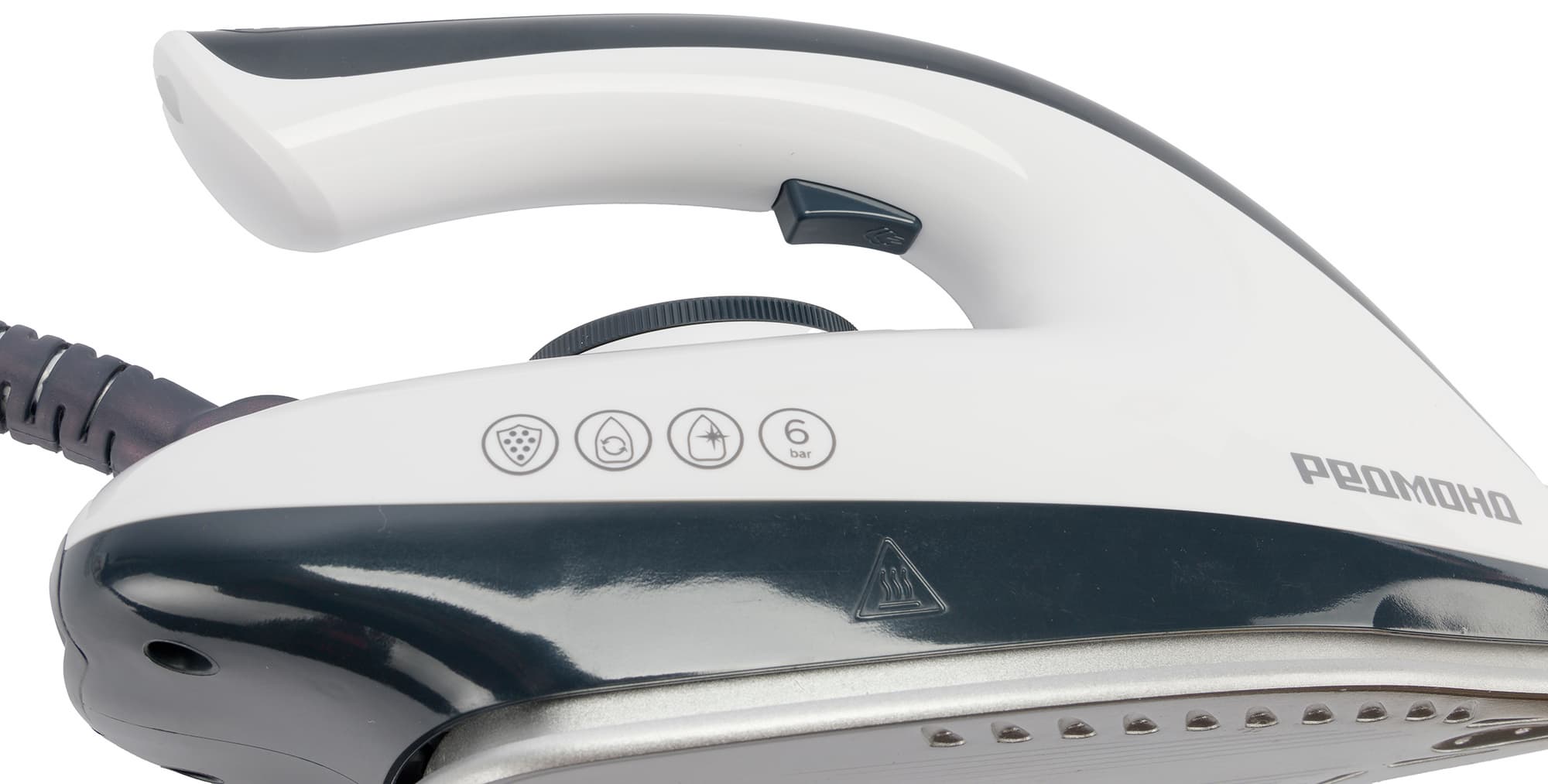 Удобная широкая ручка утюга надежно сидит в руке благодаря рельефному узору на пластике.