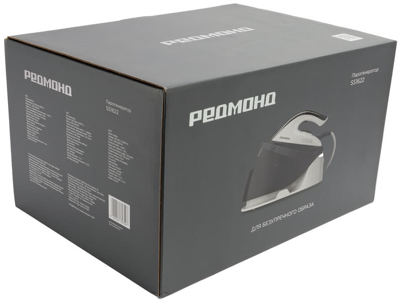 Парогенератор упакован в большую красивую черную коробку, оформленную в фирменной стилистике Redmond. На гранях упаковки размещены фотографии устройства, логотип компании, полное название модели, описание ее ключевых особенностей и краткий список технических характеристик.