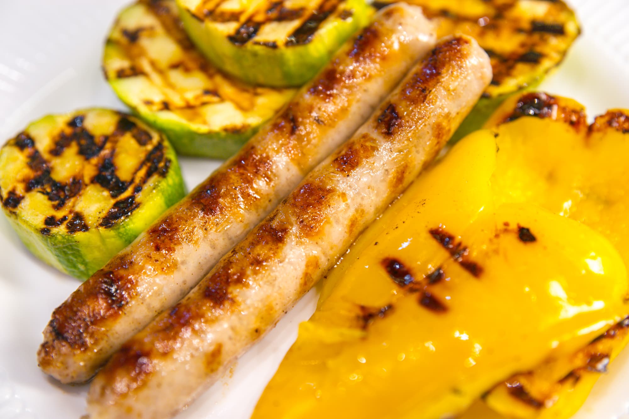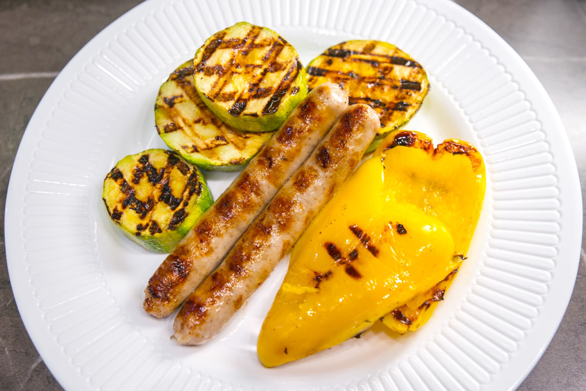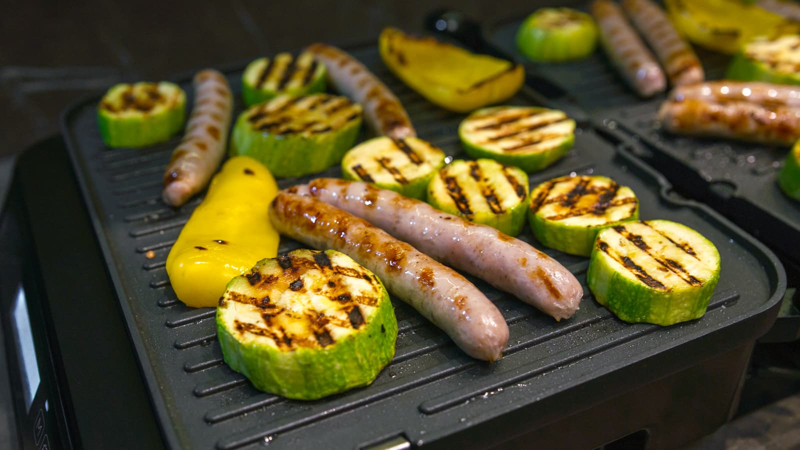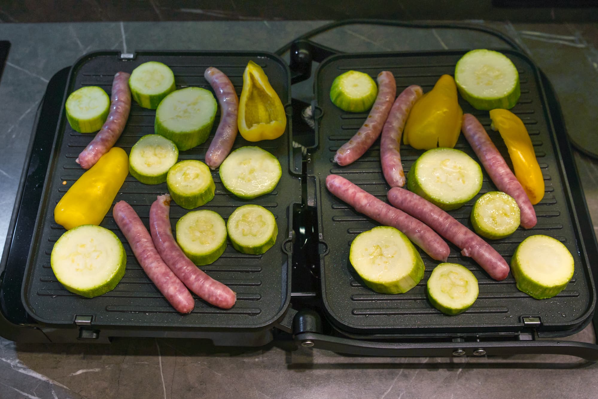Для проверки качества и скорости обжаривания продуктов на полностью раскрытых панелях мы взяли кабачок, еще один болгарский перец и колбаски.