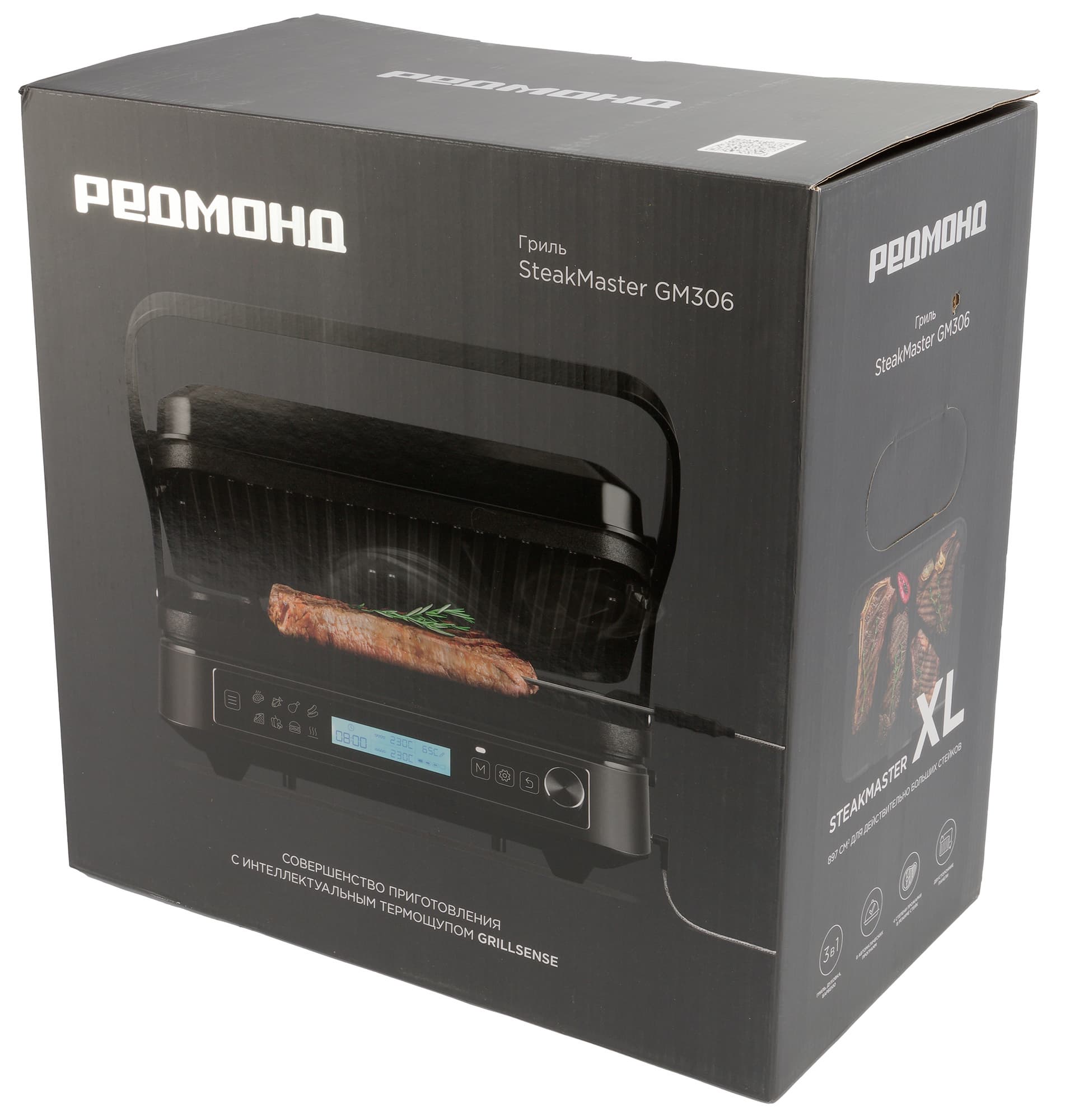 Redmond SteakMaster GM306 поставляется в симпатичной крепкой коробке, оформленной в фирменной стилистике бренда. На упаковке представлена информация, изучив которую пользователь сможет составить первое мнение о приборе: его внешнем виде, технических характеристиках и основных преимуществах.