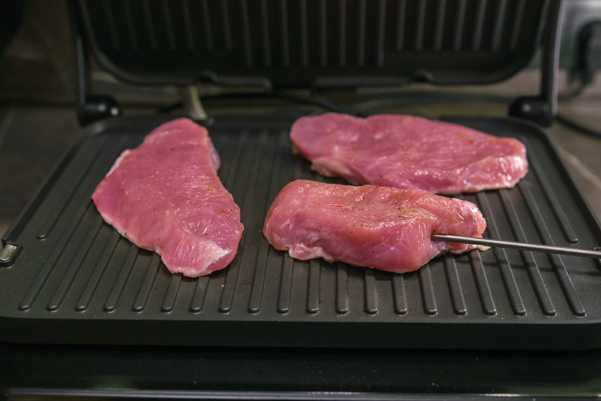 Три крупных куска филе индейки смазали небольшим количеством растительного масла, присыпали солью и выложили на панели гриля, разогретые до 220 °C в режиме Птица. Подключили термощуп к грилю и воткнули его в один из стейков. Неизменяемая температура, по достижении которой гриль автоматически выключается в этом режиме, составляет 70 °C.