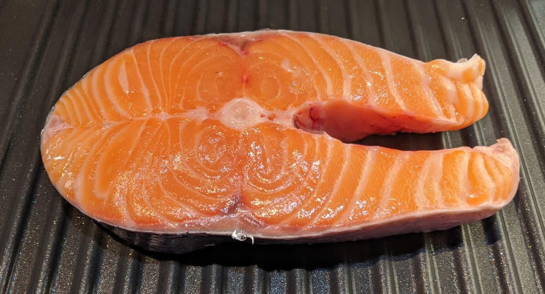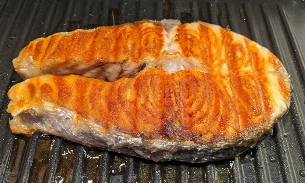 Для второго теста мы решили пожарить рыбу. Лососевый стейк толщиной в три сантиметра мы, как и в предыдущем тесте, согрели при комнатной температуре, включили гриль на режим приготовления рыбы и, дождавшись сигнала, поместили рыбу в гриль.