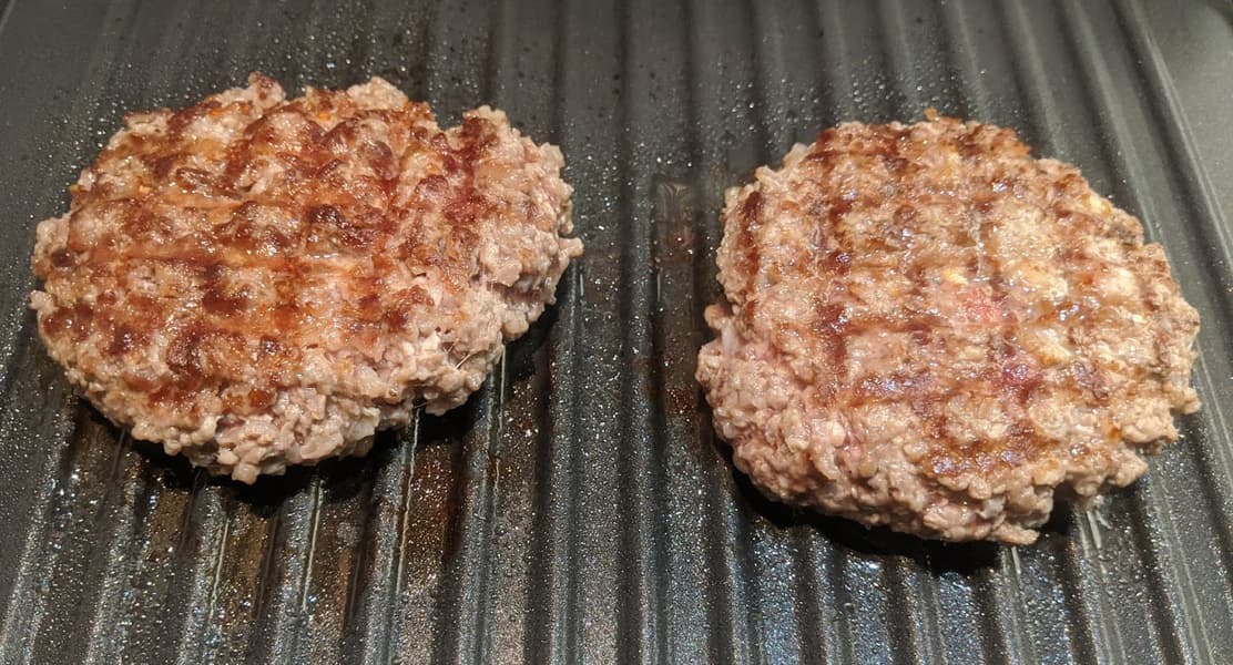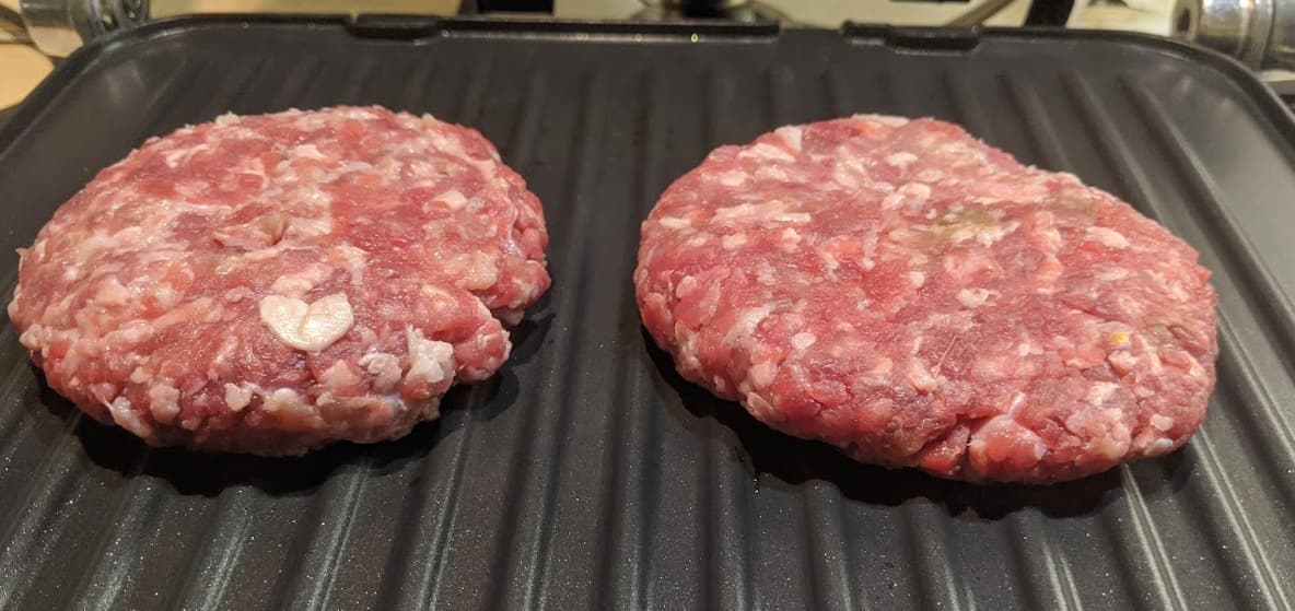 Следующим, третьим тестом у нас стал бифштекс из смеси говяжьего и свиного фарша в пропорции 1:1. Хорошо вымесив и отбив фарш, мы сформировали пару котлет и включили режим жарки мяса.