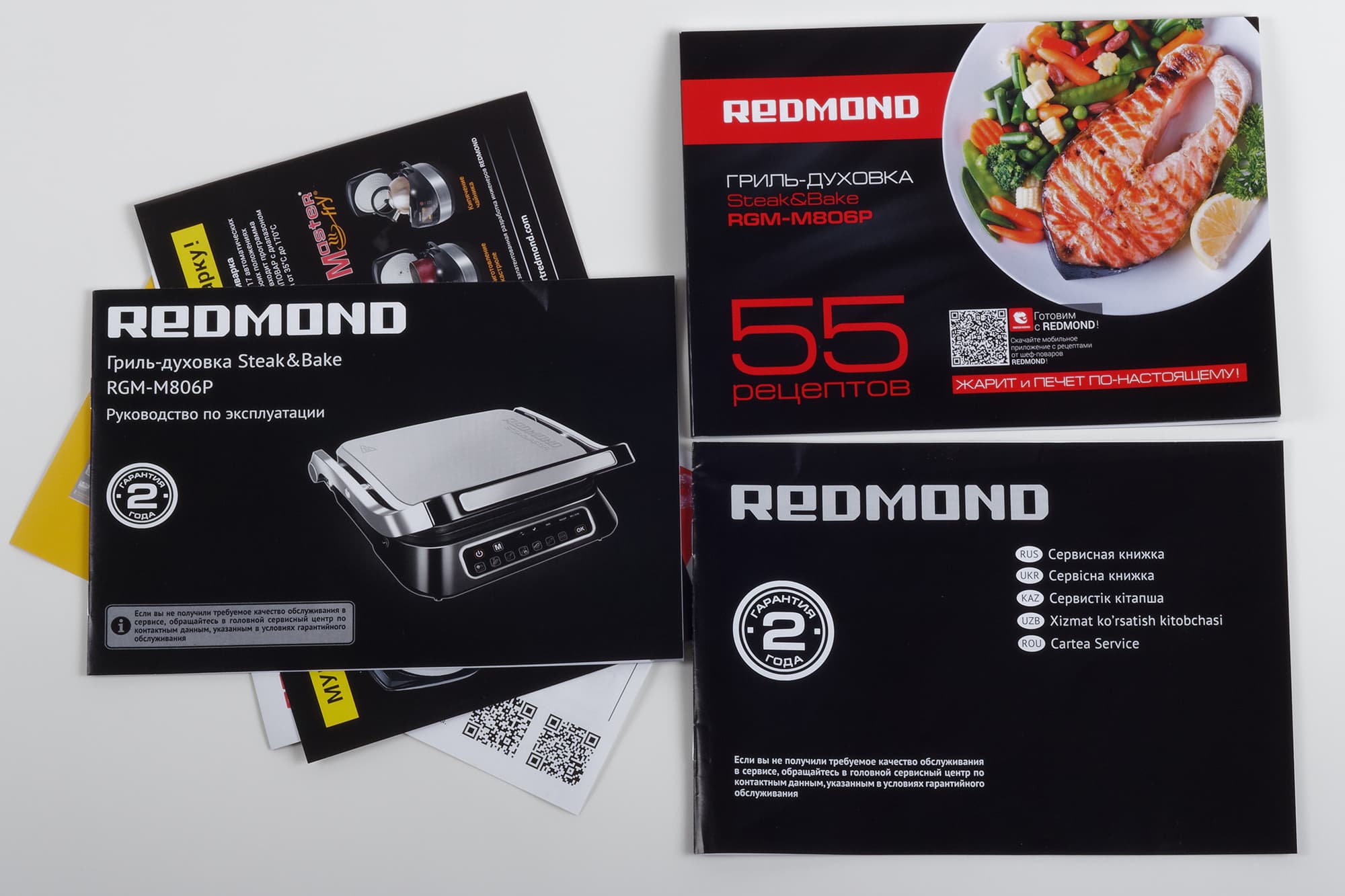 К устройству также приложена кулинарная книга Redmond из 55 рецептов, которые показывают общее направление в выборе блюд и не сковывают, а бережно направляют фантазию пользователя. Каждый рецепт содержит фотографию готового блюда, перечень ингредиентов для его приготовления и процесс подготовки и тепловой обработки блюда. На каждом рецепте есть лейбл с указанием, на сколько персон рассчитан рецепт и сколько времени потребуется на подготовку к использованию гриля. Рецепты распределены по разделам, которые перечислены в оглавлении.