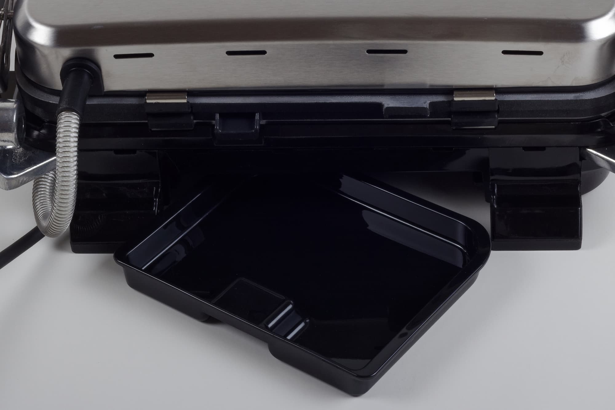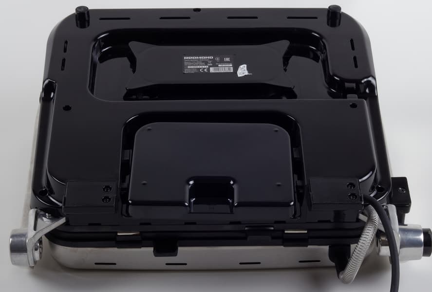 Как и у всех моделей этого ряда, поддон для стекания жира находится сзади. Это может быть не очень очевидно для тех, кто первый раз встречается с грилем Redmond, а также неудобно, если поставить прибор так, чтобы к нему не было доступа сзади. Однако поддон вставляется и вынимается легко, без усилий, и надо приложить нечеловеческие усилия, чтобы его перекосило. Мы, кстати, этого так и не добились.